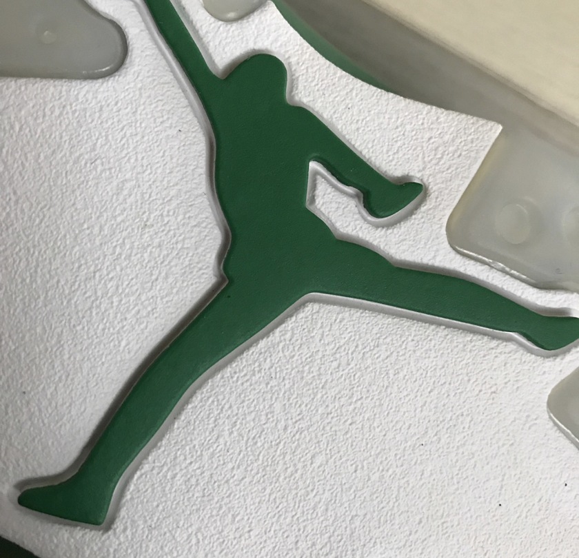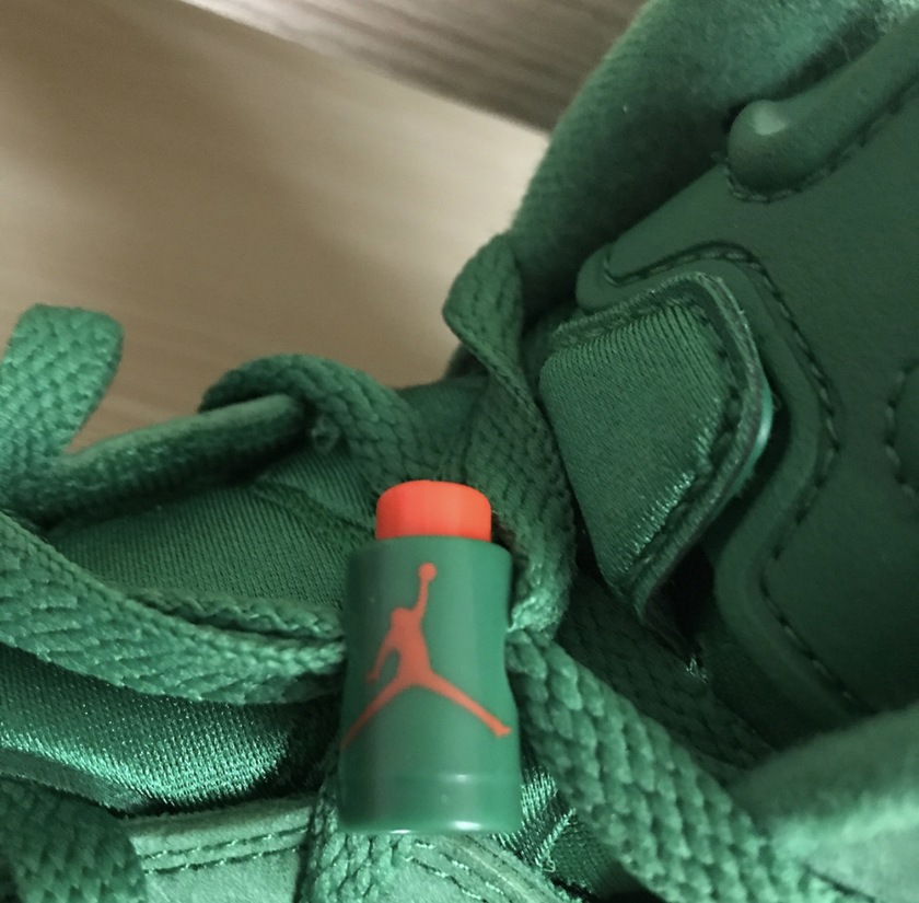 绿色的鞋身皮革,绿色的鞋带,绿色的鞋舌,绿色的鞋提,连Jumpman都绿了!万幸不是从头绿到脚,“Gatorade”品牌logo上的橙色还是在个别细节处有所体现,大底部分用了白色橡胶和透明橡胶装饰。