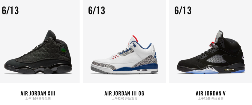 北京时间6月13日凌晨0点,Nike中国区官网无预警补货三款Air Jordan鞋款,分别为Jordan 13“Black Cat”,Jordan 3“True Blue”以及Jordan 5“Metallic Silver”,三款球鞋不久便被秒光。