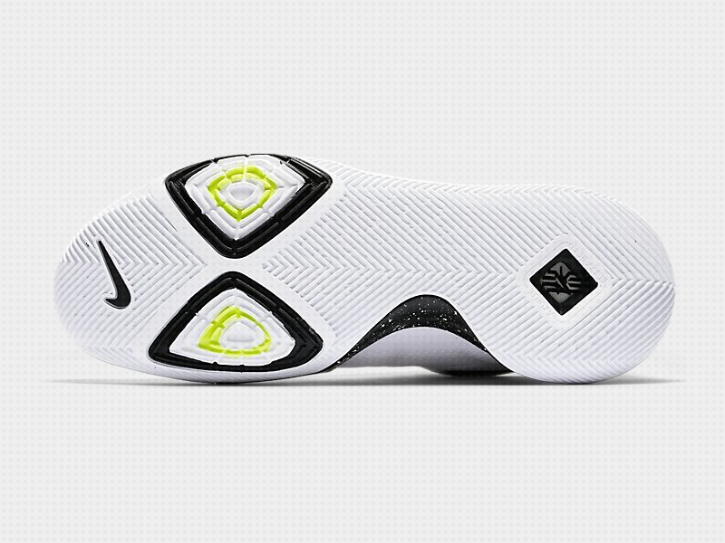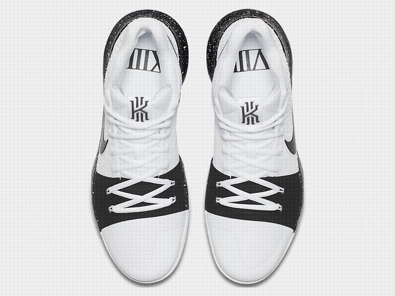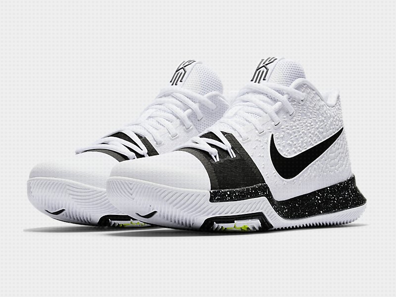 新款Nike Kyrie 3官图提前预览,配色上黑白色调覆盖了整双鞋,黑色中底上用了白色泼墨点缀,白色大底在前掌图案中装饰了荧光绿色彩。