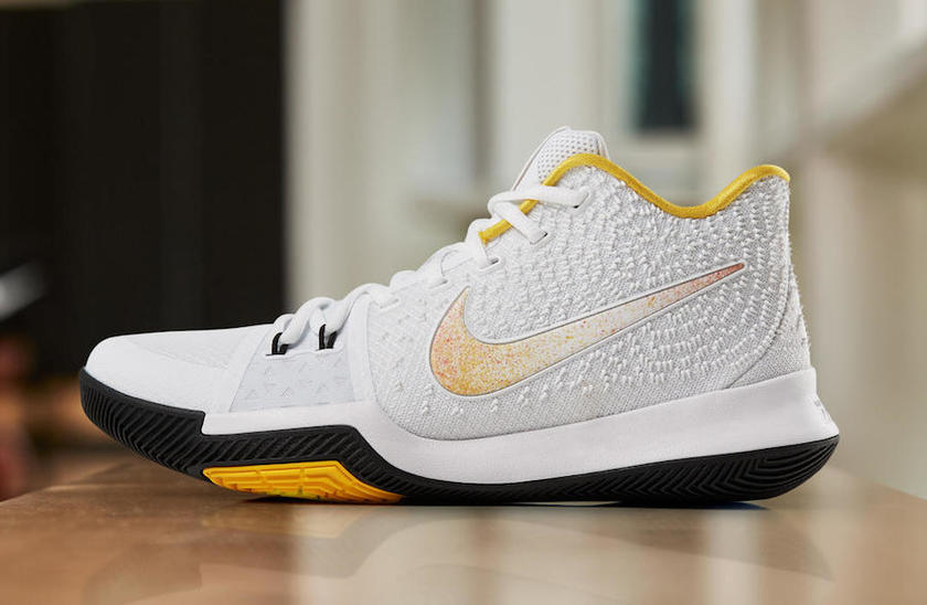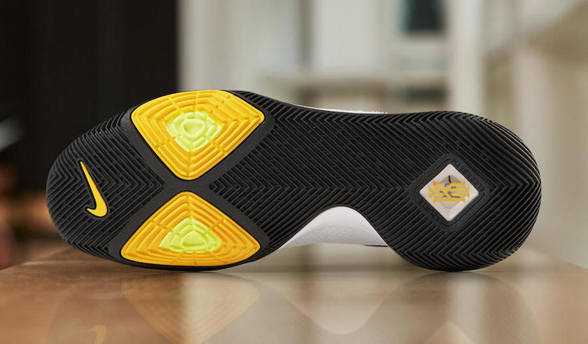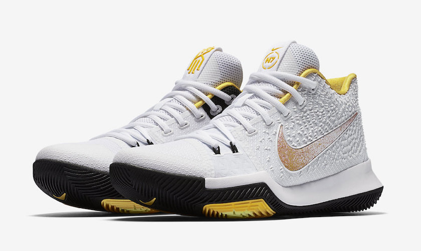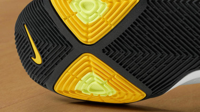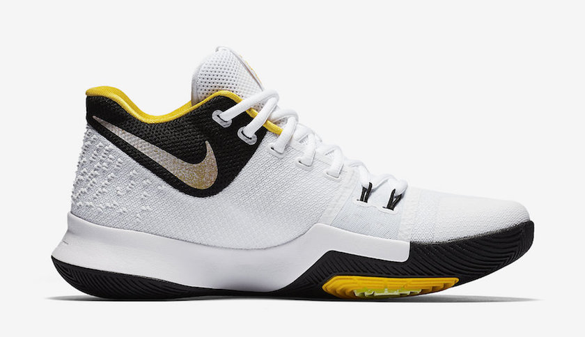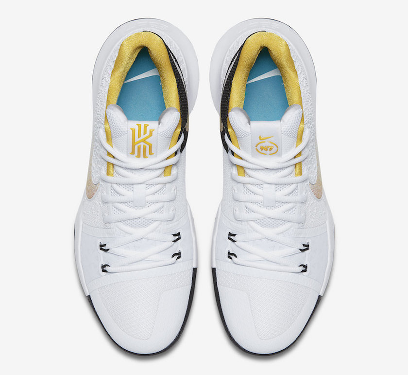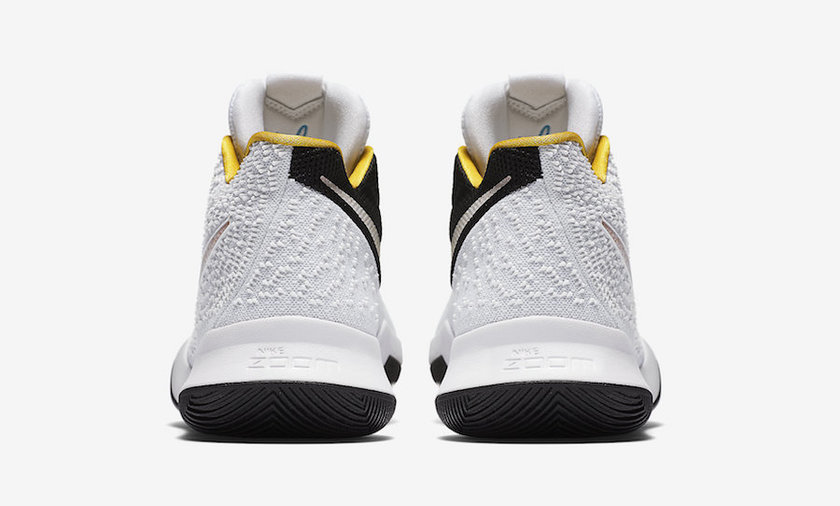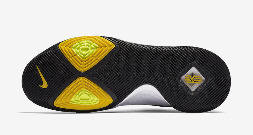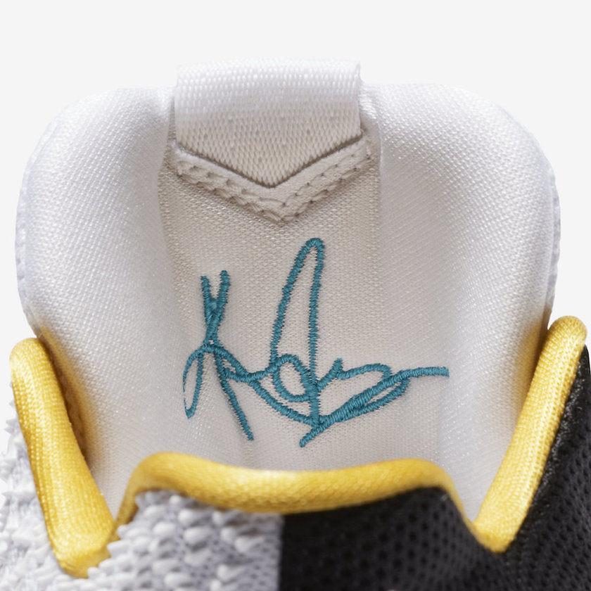 该鞋款采用白/黑/黄三色主题色调,在鞋垫和鞋舌内侧Kyrie logo上装饰了天际蓝。