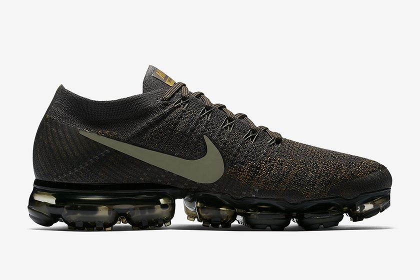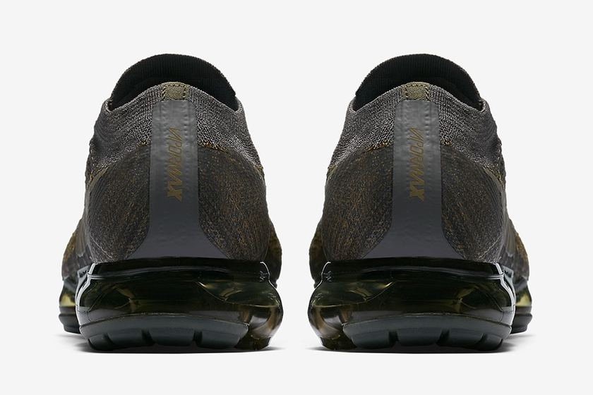 紧接“BETRUE”配色之后,Nike 在今月还将为人气革新之作 Air VaporMax 带来两双全新配色。其中这款“Cargo Khaki”配色早前已经曝光过,Flyknit 鞋身与 VaporMax 透明大气垫鞋底选用在街头界向来颇受青睐的军绿色贯穿,并于鞋面融入金色斑点细节点缀,视觉效果非常出众。