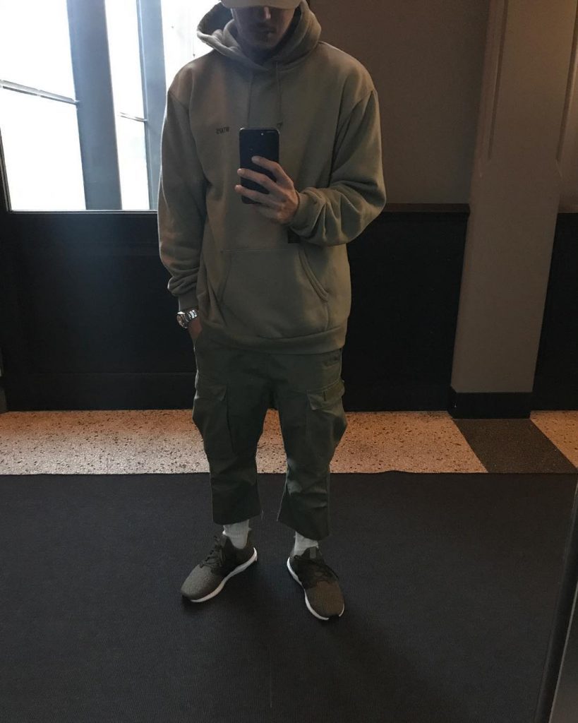 今日余文乐在Ins上发布了他的“今日穿搭”,应该是对自己今天这一身非常满意吧!而且这两张照片发布时间相隔十分钟,余文乐先是发布了一张全身照,从照片上看他今天似乎大走军事风格,无论是帽衫、9 分工装裤还是脚上的 UltraBOOST 3.0 都是纯粹的军绿配色。