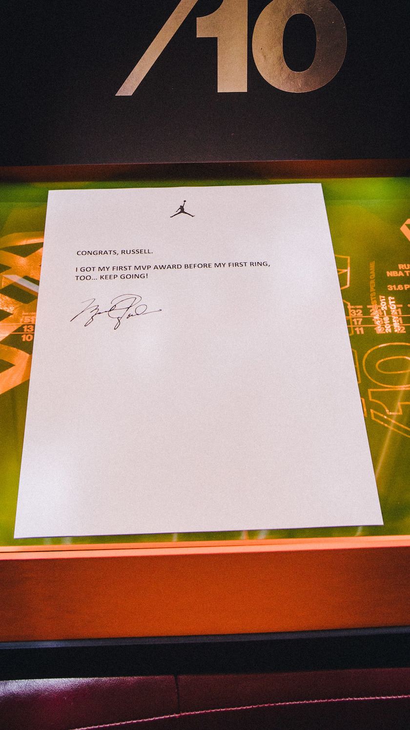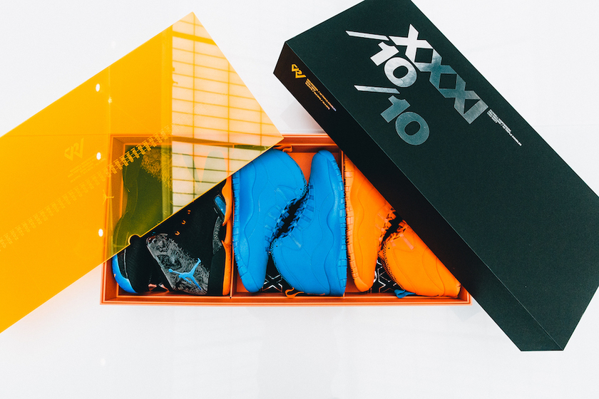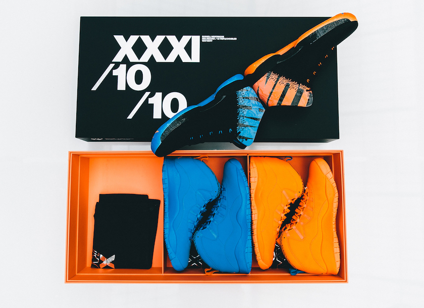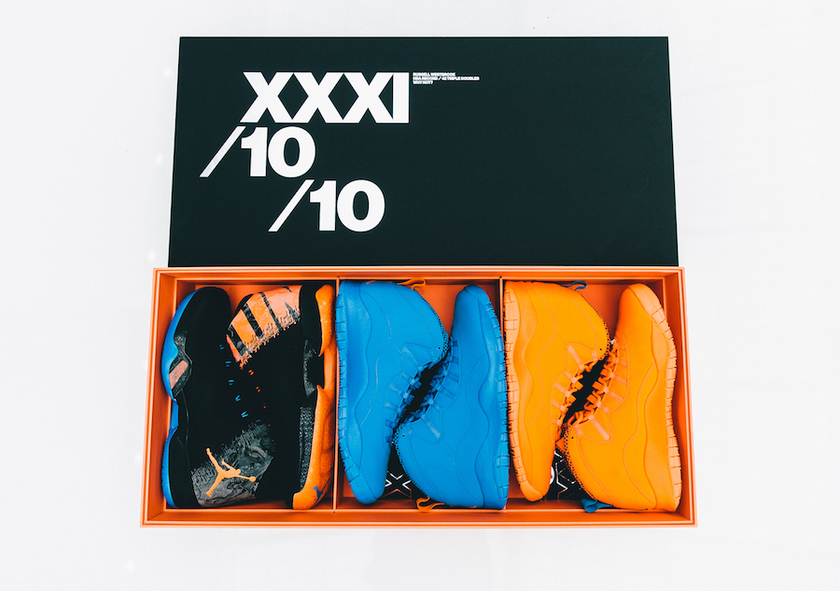该套装礼盒包括了一双Air Jordan 31 “Why Not”和两双雷霆队配色Air Jordan 10以致敬威少在赛季中31分+10篮板+10助攻的三双数据。除了球鞋,盒内还有Michael Jordan对威少的寄语和亲笔签名。