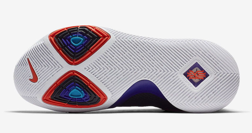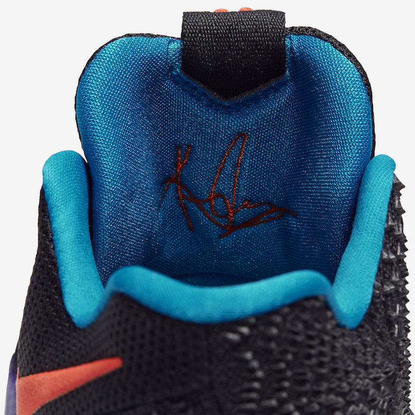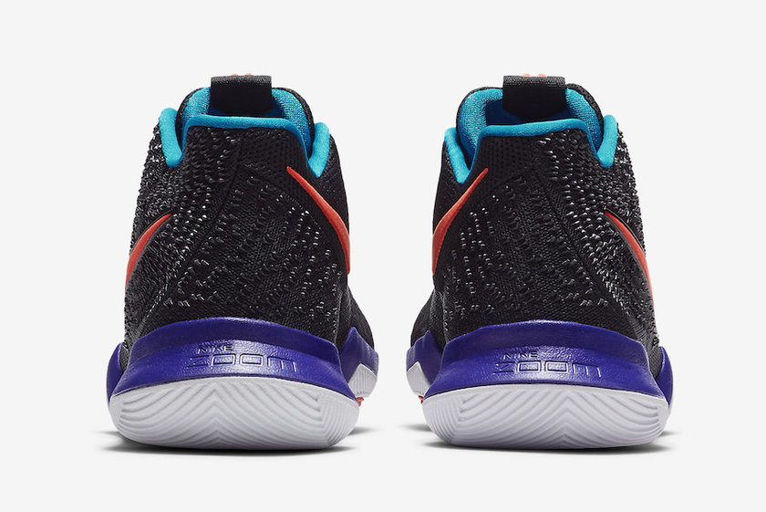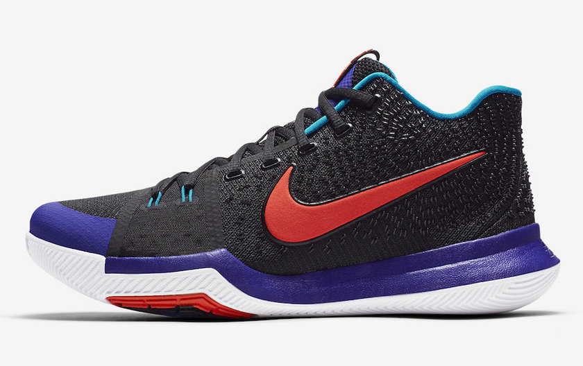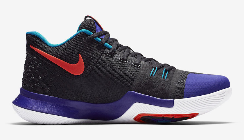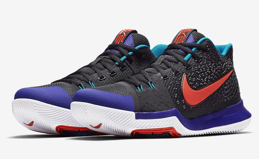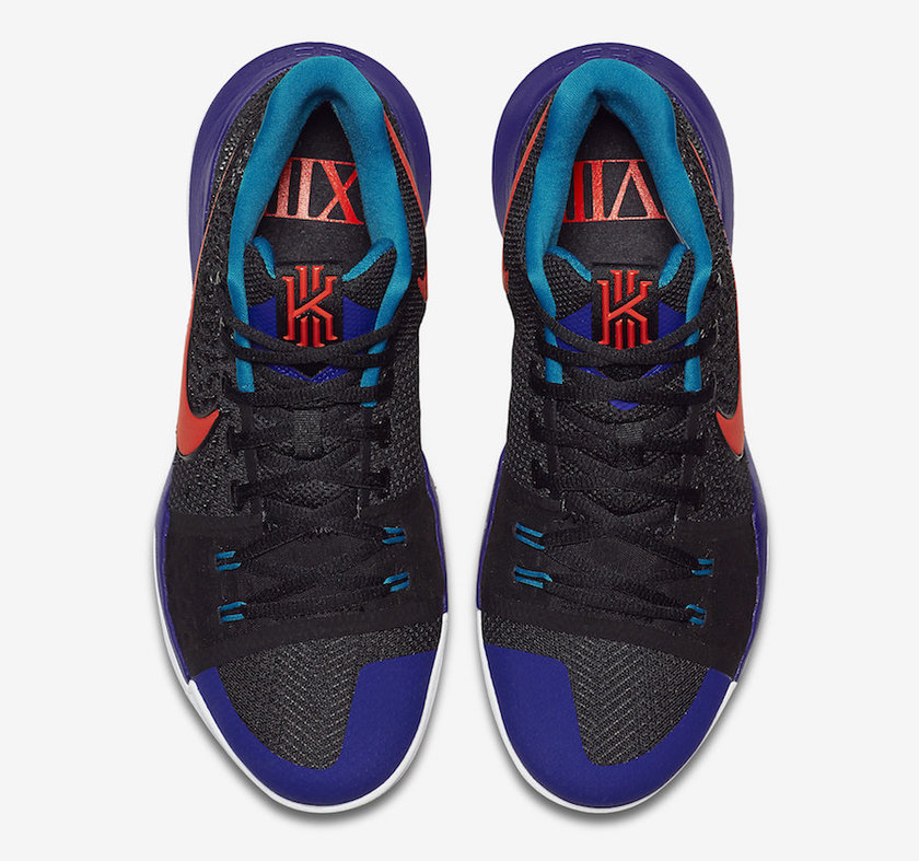 该鞋款以黑色为主色调,鞋口采用淡蓝色点缀,Swoosh与鞋舌Logo以及鞋底图案等细节部分则由橘红色与紫色进行渲染。撞色风格这样演绎在Kyrie 3上定是吸睛无数。