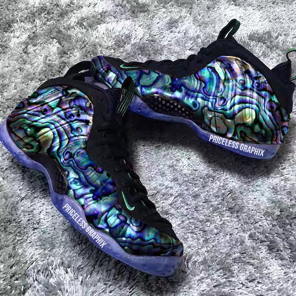 眼下这幅效果图是来自@pricelessgraphix的作品,图中呈现鞋款就是日前曾经流出发售消息的Air Foamposite One “Abalone”的假想图。可以看到该假想图用上了鲍鱼内侧多彩图案做为鞋面配色灵感,鞋舌内衬部分用了黑色渲染,在大底的选择上也是不出意外得选用了蓝色水晶底。