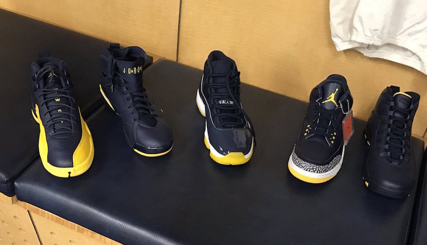 眼前这5双Air Jordan鞋款是来自Michigan Wolverines的PE鞋款,这些Air Jordan 3,7,10,11,12鞋款均使用了深蓝和校园黄作为配色主题。