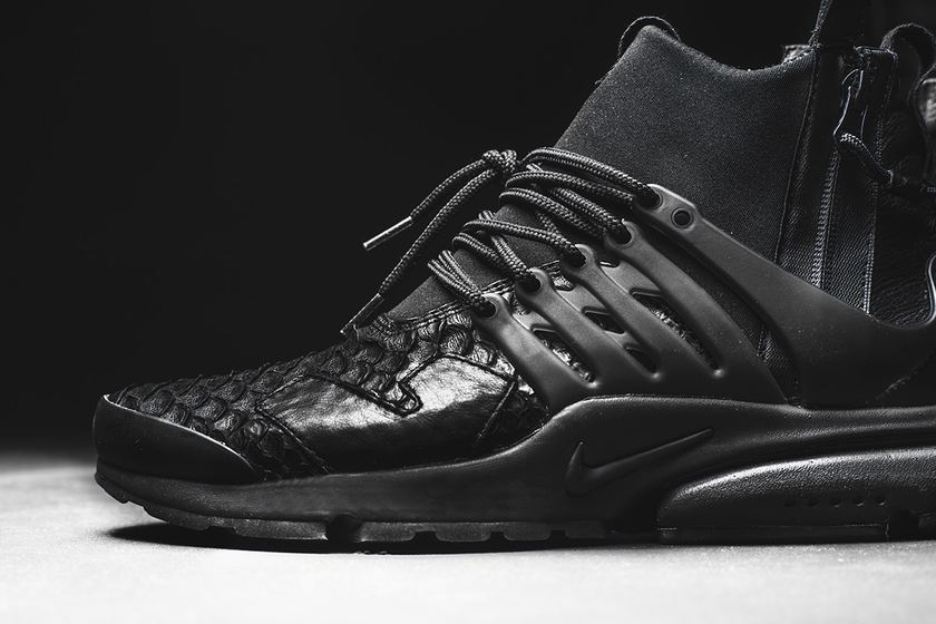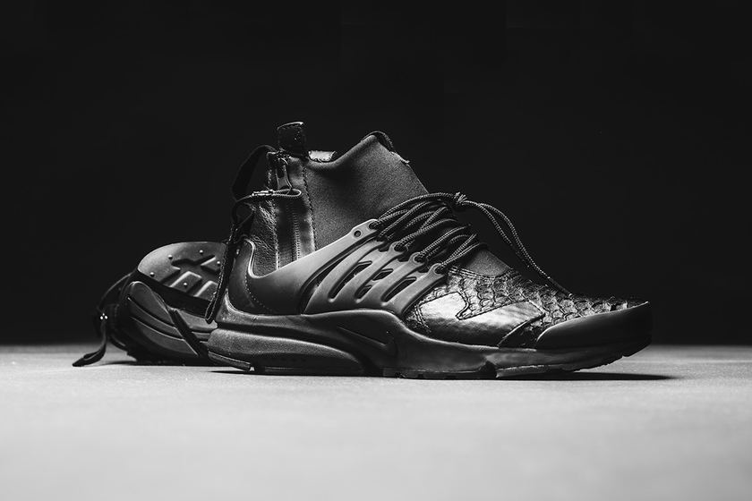 在上个月巴黎男装周期间于 NDG Studios 与 Plan8 Studios 两家 Pop-Up 中独家预售后,洛杉矶球鞋客制专家 The Shoe Surgeon 正式宣布全新打造的 NikeLab x ACRONYM Presto Mid 定制鞋款将于 7 月 14 日于官方网站上架。以 NikeLab 与机能品牌 ACRONYM 合作打造,可算是去年最成功联名球鞋之一的 Presto Mid 为原型,The Shoe Surgeon 通过氯丁橡胶、防水拉链和支架还原其中筒造型,而全黑色调与蟒蛇皮的运用则注入了强烈的暗黑气息。这双定制 Presto Mid 售价为 $1,100 美元,将仅限量 25 双。