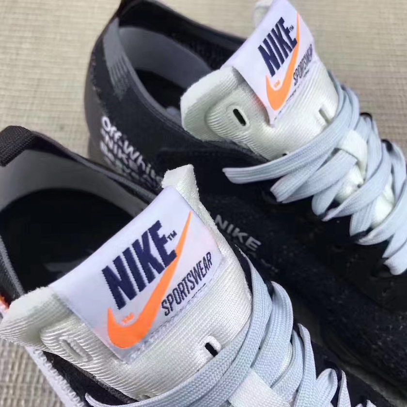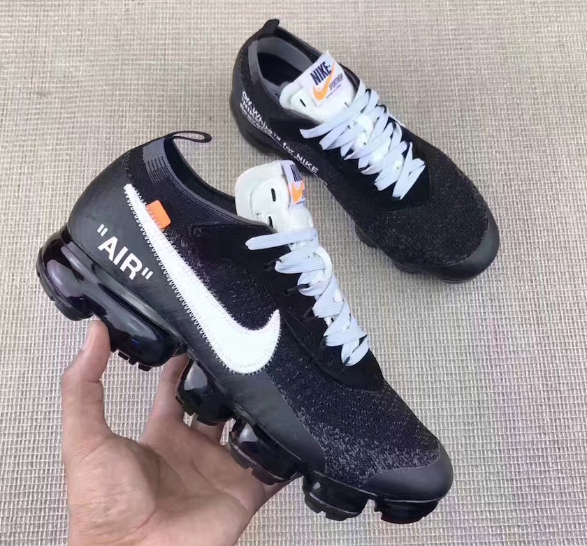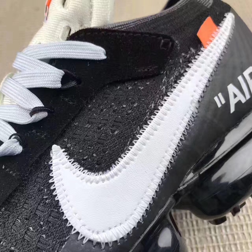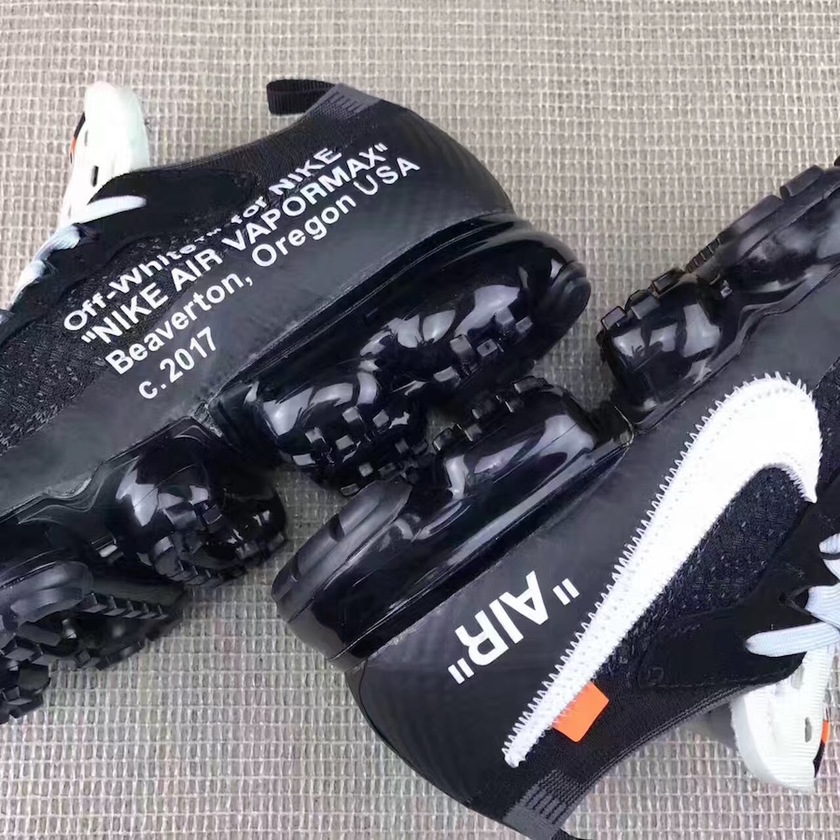 OFF-WHITE x Nike Air VaporMax采用酷酷的黑色作为主色调,却搭配了一个非常复古的“开放式”鞋舌设计,并在鞋身侧边以白色文字彰显了自己的联名身份及Vapormax的“出生地点、日期”。外侧则以Z字形缝线包裹巨大白色Swoosh LOGO,并配上“AIR”字样。最后搭配黑色的全掌气垫鞋底,带来强烈的视觉效果。