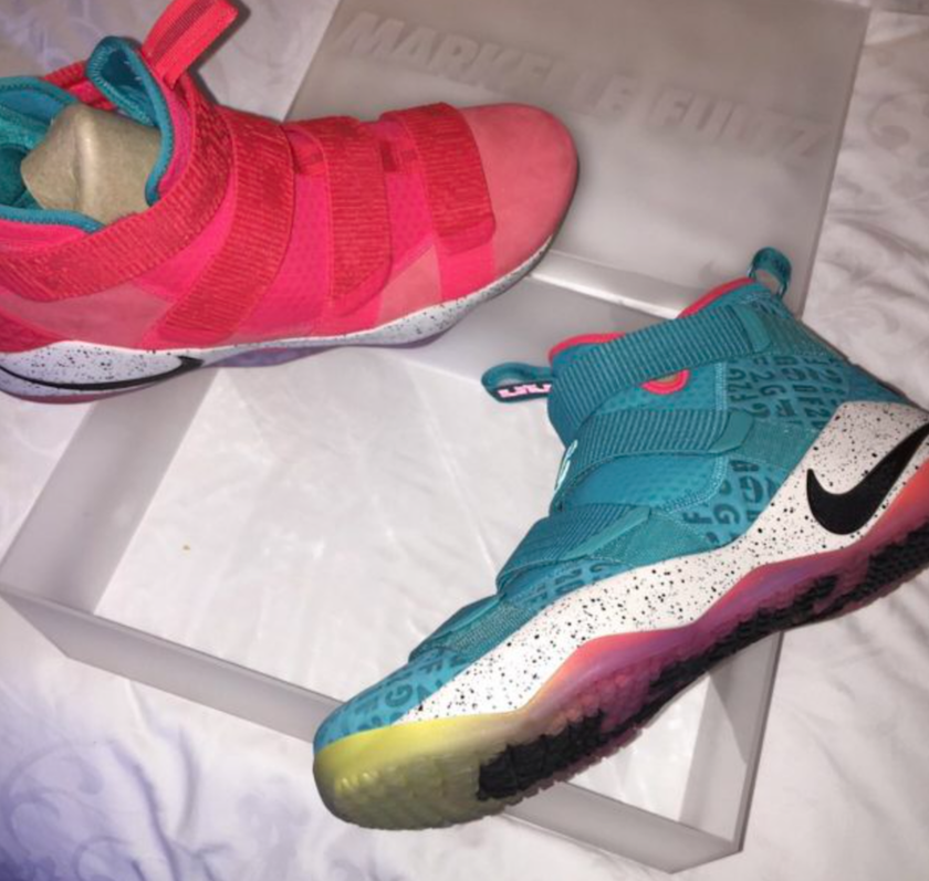 今年的状元秀Markelle Fultz近日收获了自己的专属LeBron Soldier 11 PE。该PE用极具个性的鸳鸯配色渲染,左右分别用了电光粉和湖绿色包裹,内衬颜色也是左右呼应,中底上用了泼墨外在大底上选择了渐变色的水晶底加持,魔术贴上还添上了疑似Markelle Fultz个人Logo。