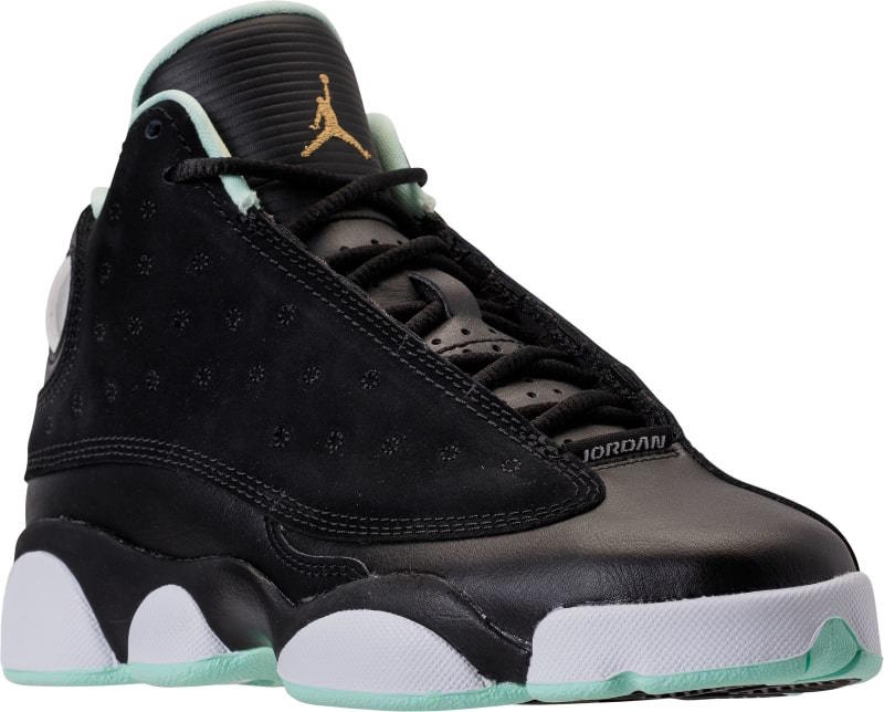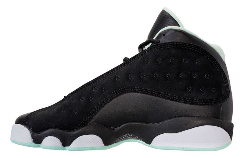 Jordan Brand将在本月下旬推出这款Air Jordan 13 GS “Mint Foam”。由黑色麂皮和光滑皮革拼接组成鞋面,中底和鞋带也用了黑色渲染,薄荷绿则使用在了内衬和大底上,色彩斑斓的猫眼依旧点缀在了鞋帮侧面。另外鞋舌处的Jumpman Logo使用了金色刺绣手法展现。