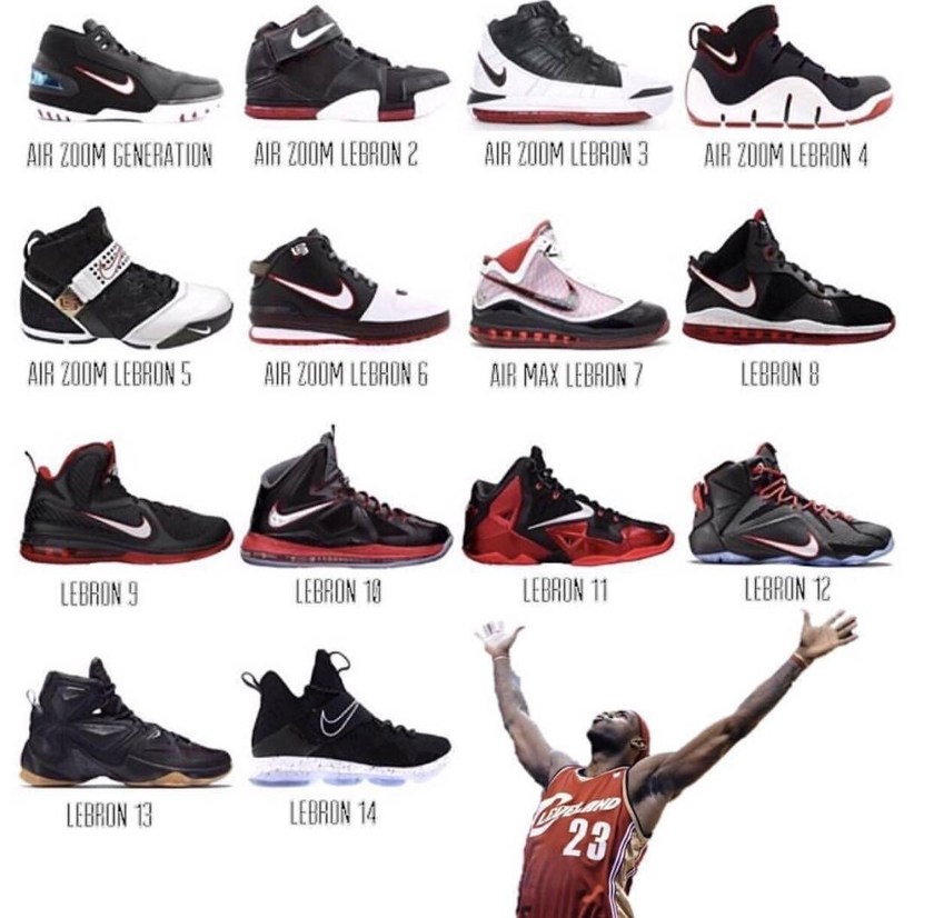 上面这张图包含了到目前为止詹姆斯所有的正代鞋款。不难看出,相比前13代,LeBron 14的外观显得不再那么霸气,反而多了几分“温婉”。按理说,“霸气”是勒布朗的战靴最应该具备的特质,这样才能更匹配詹皇的气质。而LeBron 14的设计不知是否遇到了瓶颈,似乎并未给球迷带来十足的惊喜。之前也曾有消息说勒布朗本人不满意LeBron 14的设计,所以该鞋款的发售时间有所延迟。
