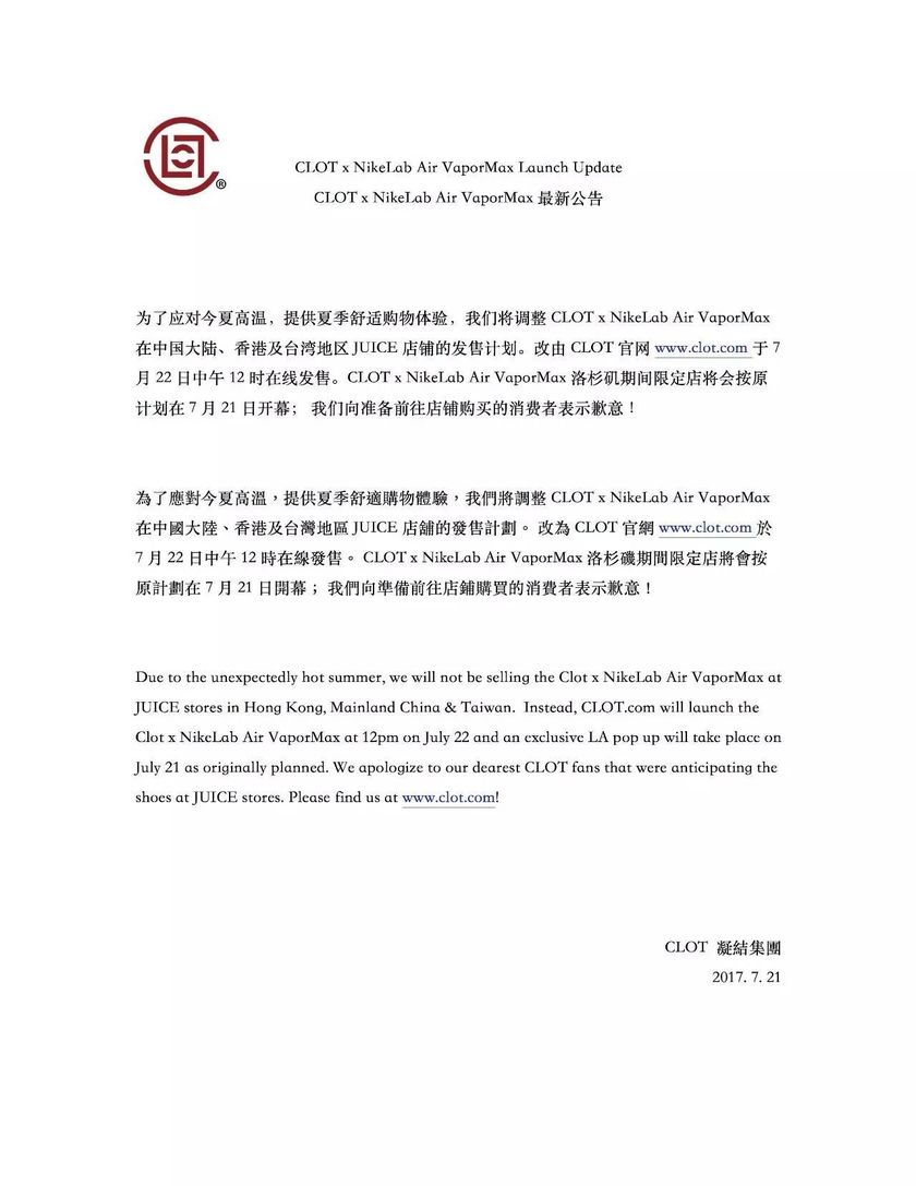 原本明天发售的Clot x Nike Vapormax 将在Juice门店进行发售,不过天气太热了,发售方Juice通过综合考虑后,决定将门店发售改为在线发售。所以准备购买这双鞋的朋友明天不用去门店排队咯,不然跑空一趟就不开心了。