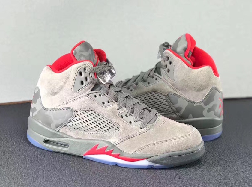以战斗机为灵感设计的Air Jordan 5自然少不了军事风格的装扮。此款Air Jordan 5 “Camo”用橄榄绿和麂皮的搭配,辅以迷彩图案,成功营造了浓浓的战场风格,红色细节的点缀让鞋款更具紧张感。鞋款将于9月份登陆货架。