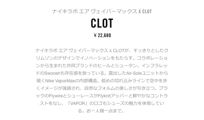 同时,今日( 7 月 28 日),这双超级抢眼的 CLOT x NikeLab AIr VaporMax 已经正式登陆日本地区,将通过 NikeLab 渠道发售,发售价为 ¥22,680 日元。