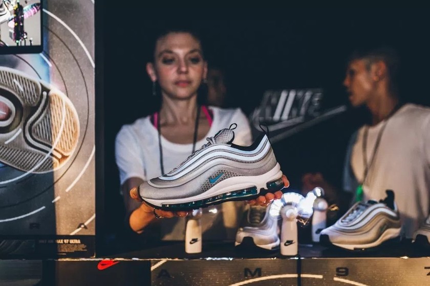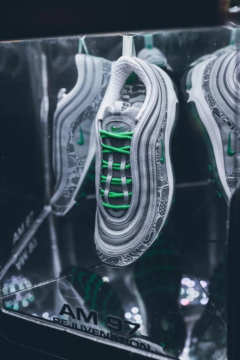 我们看到墙壁上覆盖着带有复古灵感的Air Max 97海报,其中包含了关于经典Nike运动员的历史,还有各种配色的Air Max 97在展柜中360度无死角的展示着,绝对是鞋迷们的视觉盛宴。这是属于Air Max 97的狂欢!