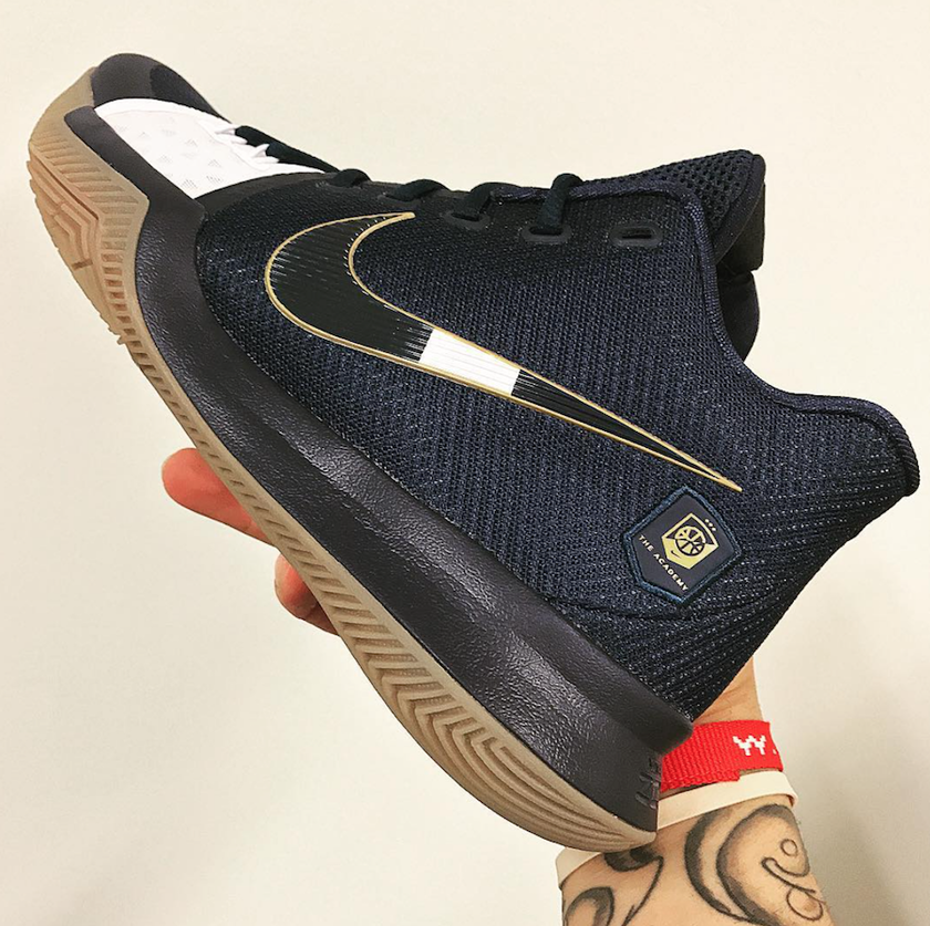 Nike Basketball Academy别注系列PE今日释出了该主题Nike Kyrie 3。生胶大底、深蓝色鞋面、金色勾勒以及黑白色彩在该鞋款上混合使用,效果也相当不错。盾形篮球学院Logo出现在了鞋款的后跟处。