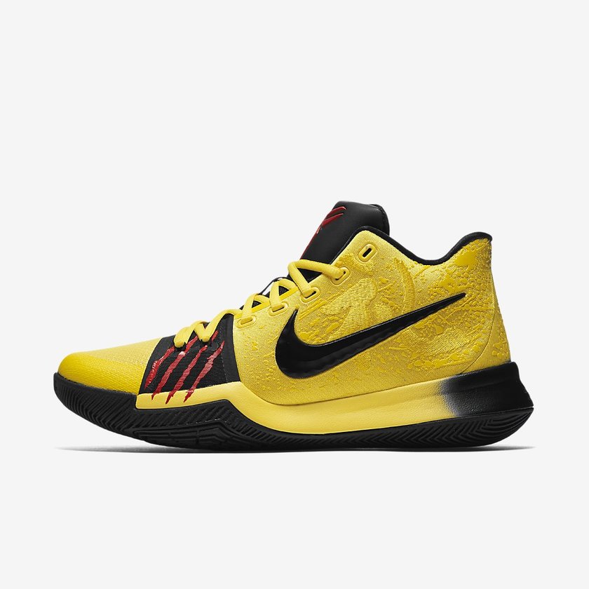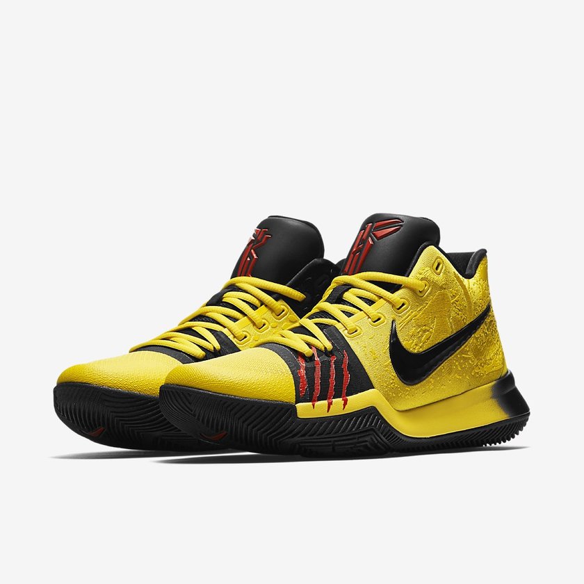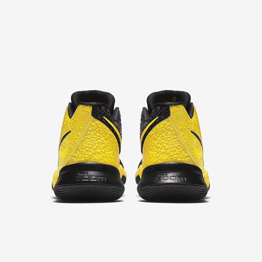 这双 Kyrie 3 “Bruce Lee” 采用了源于 Nike Kobe 5 “Bruce Lee” 的黑黄装扮,四道血痕加上Kyrie 和 Kobe“双K”合体Logo,其意义已经超过球鞋本身!