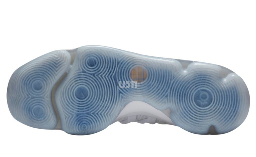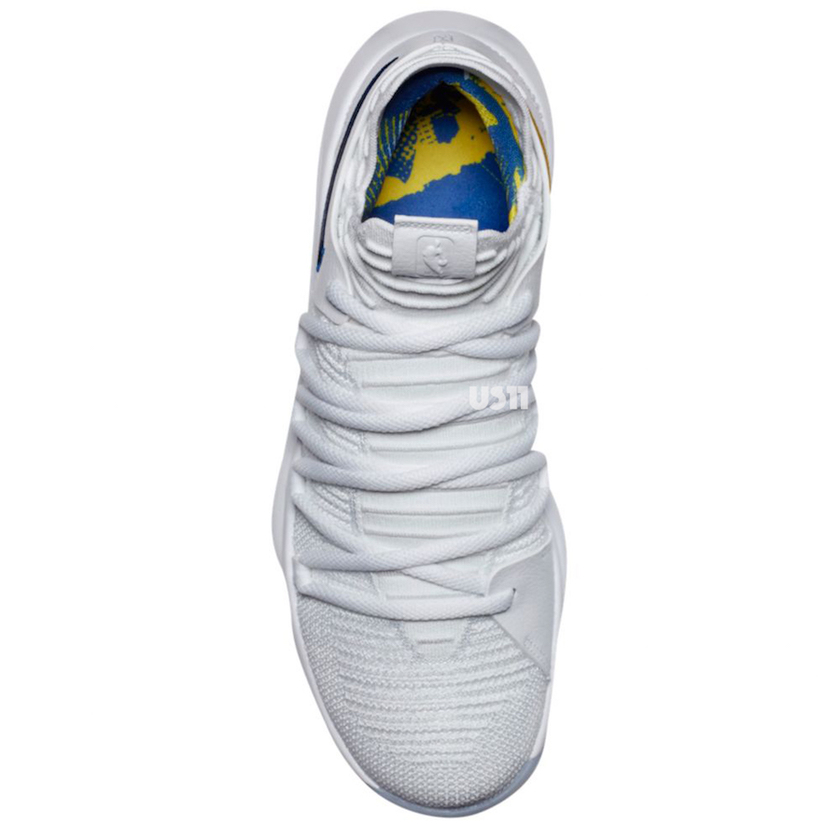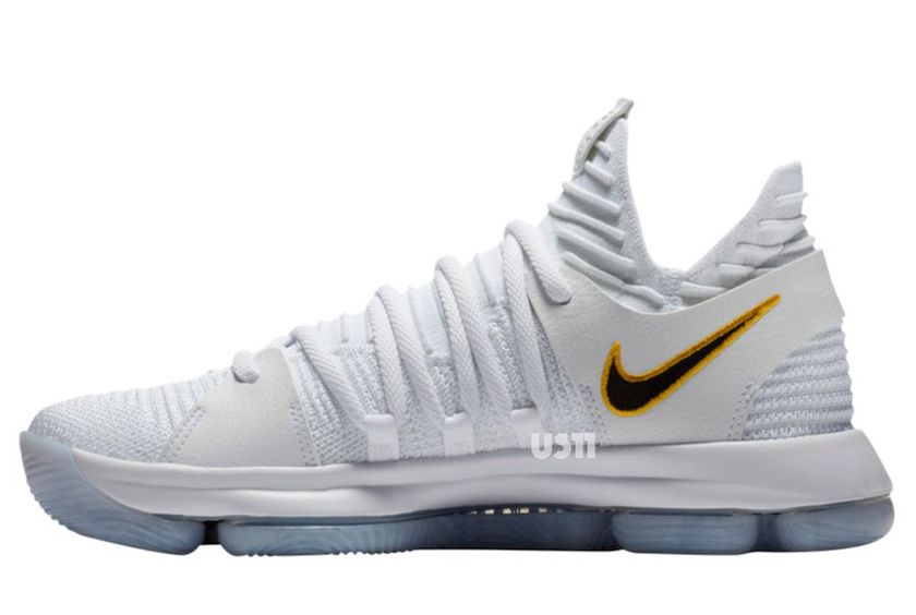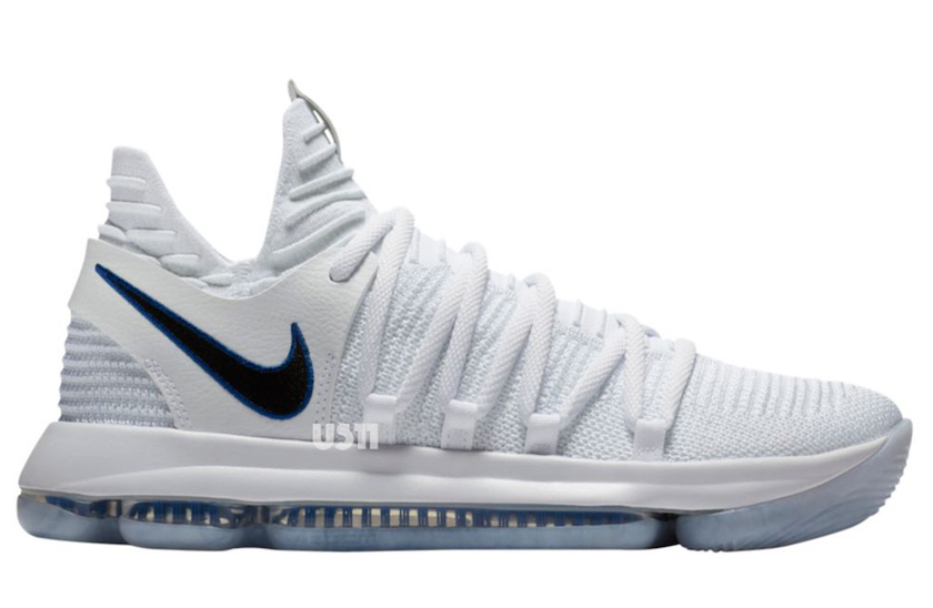 此款Nike KD 10是为NBA揭幕战特别准备,白色鞋身搭配冰蓝色水晶底,内外Swoosh分别用蓝色、黄色勾勒,白色鞋舌上还镶嵌了NBA Logo。