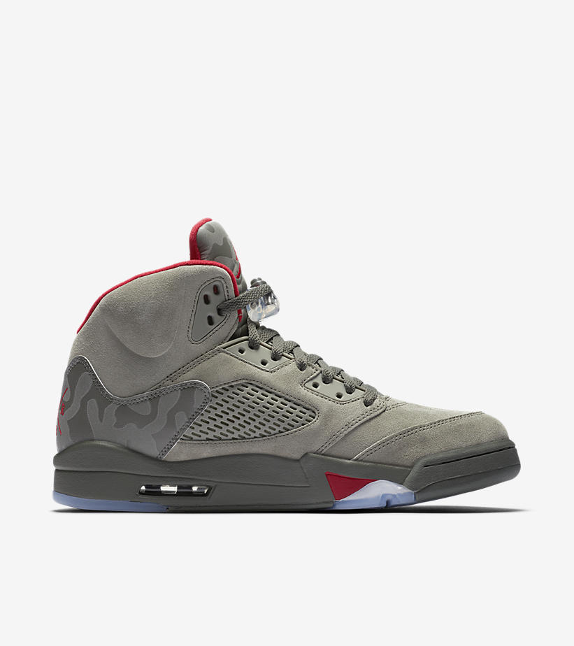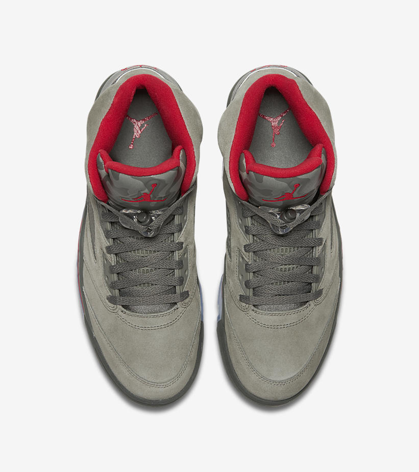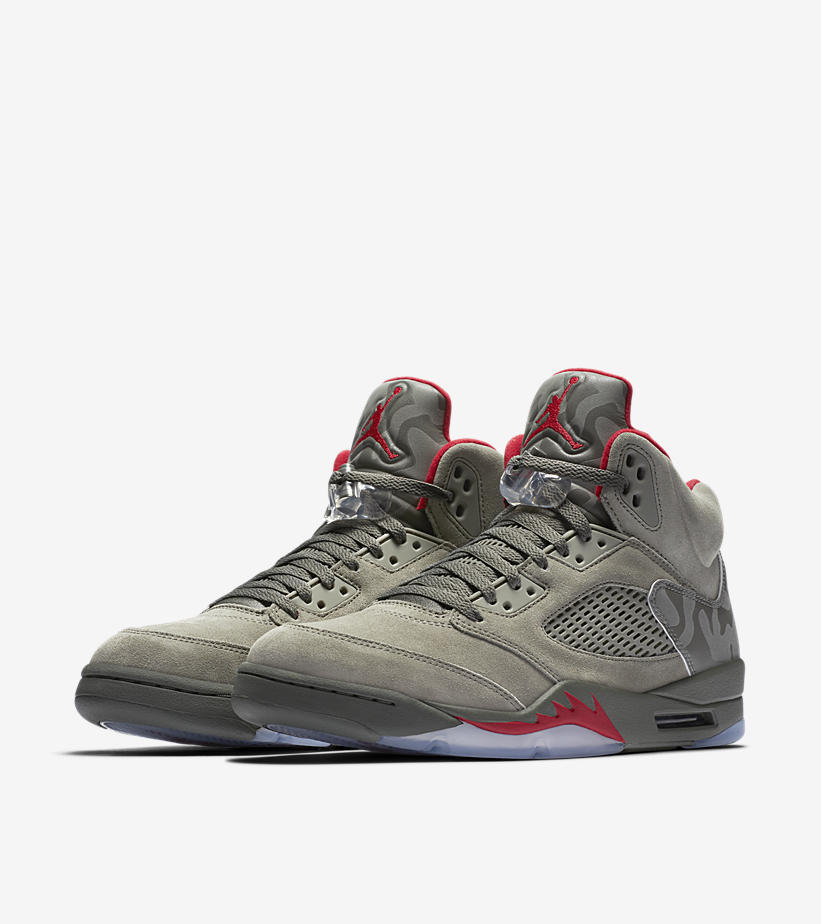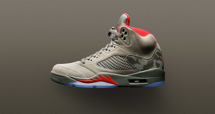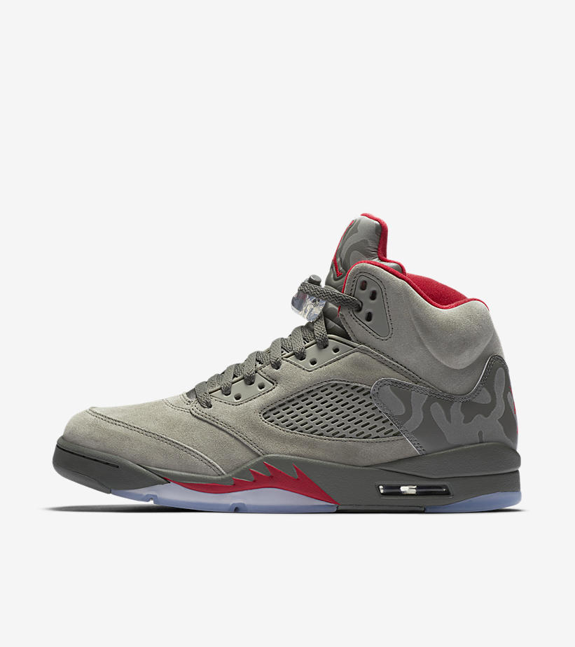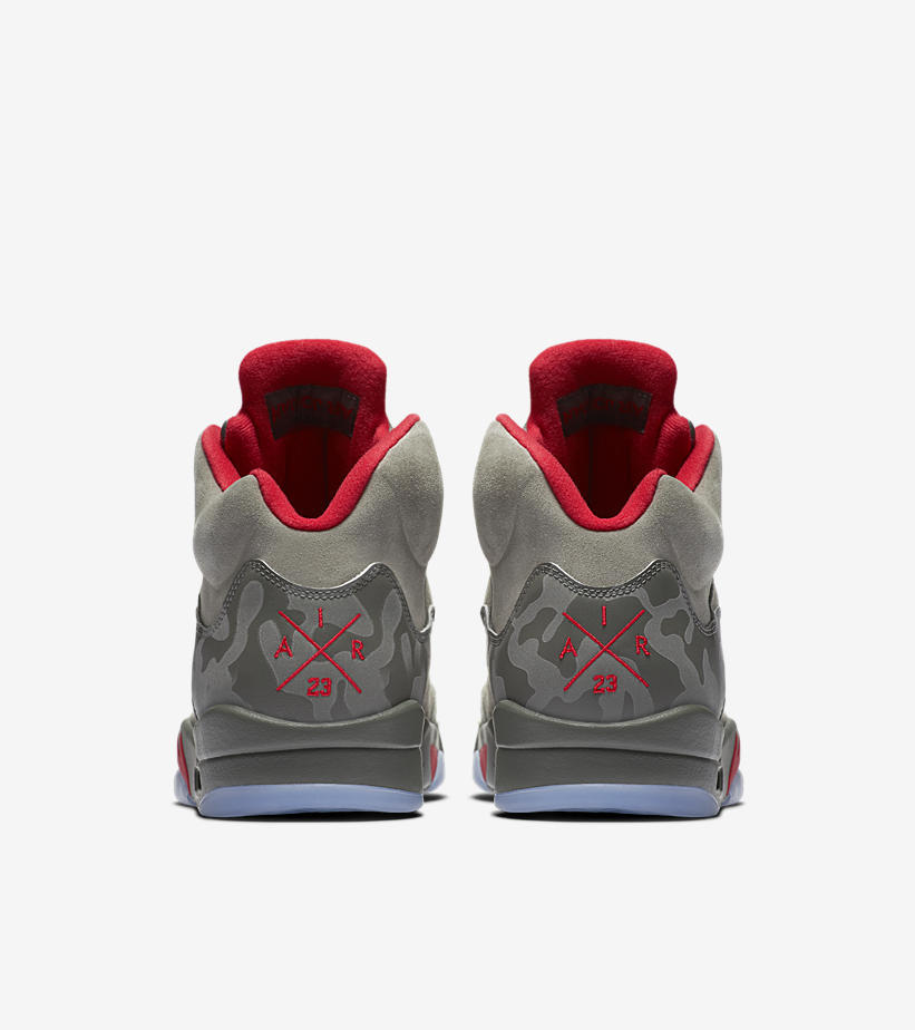 这款与Supreme x Air Jordan 5神似的Air Jordan 5 “Camo”今日登陆Nike.com。配色方面,鞋款由军绿色为主题,以校园红“鲨鱼齿”搭配冰蓝水晶底点缀,后跟和鞋舌的反光迷彩印花与军旅风格的绿色调形成巧妙搭配。