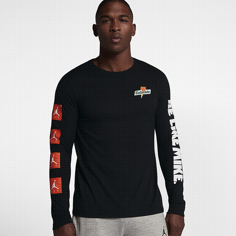 Jordan Brand 与 Gatorade 合作的系列服饰再度曝出模特上身预览,此番释出的为黑色系列长短袖T恤和短裤。Gatorade Logo 依旧醒目,有意思的是长袖T恤的右臂部分竟然一次性放置了4个 Jumpman Logo,与此对称的是左臂上白色填充的“Be Like Mike.”字样。