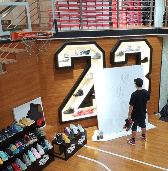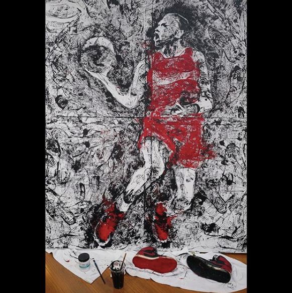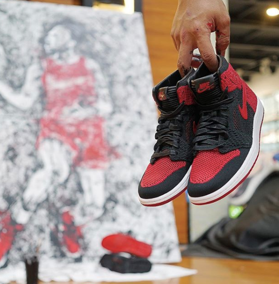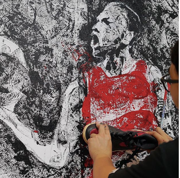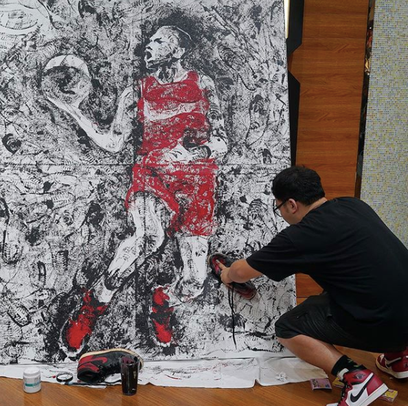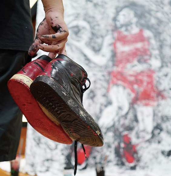来自广州XH55的作品,一幅使用了 Air Jordan 1 Hi “Banned”作为绘画工具的作品。