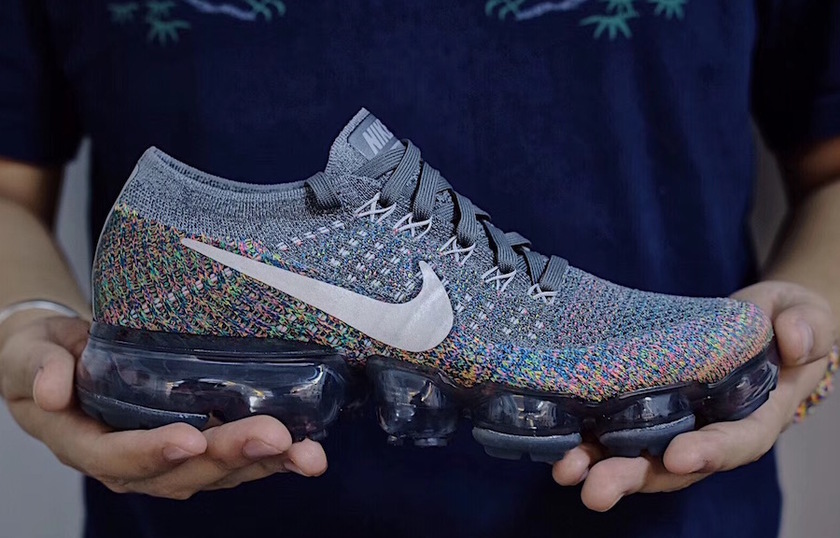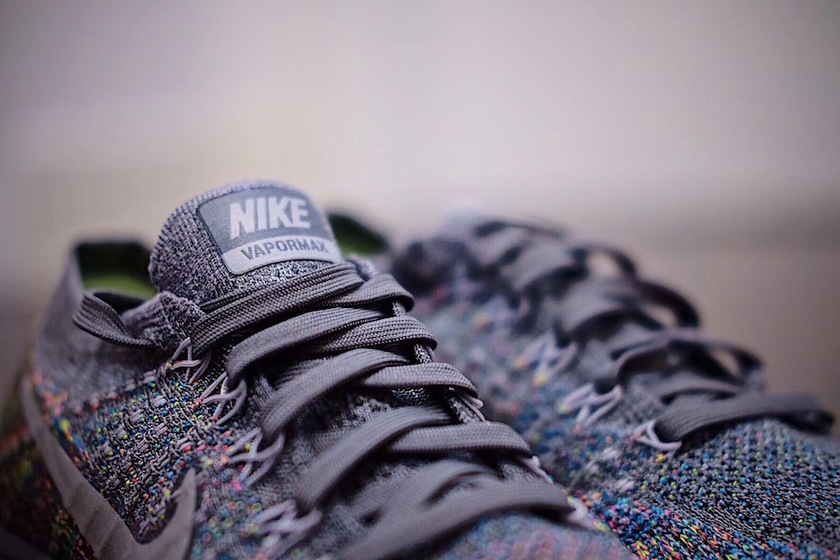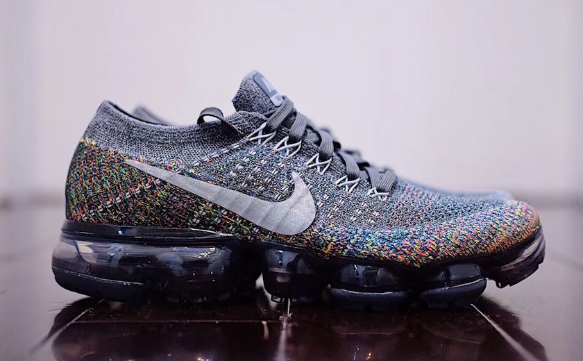 Flyknit鞋身采用灰色作为主色调,融入彩虹色点缀,不会太突兀,却在细节之处让你有特别的感受。最后搭载灰色vapormax气垫鞋底,你觉得能打几分?
