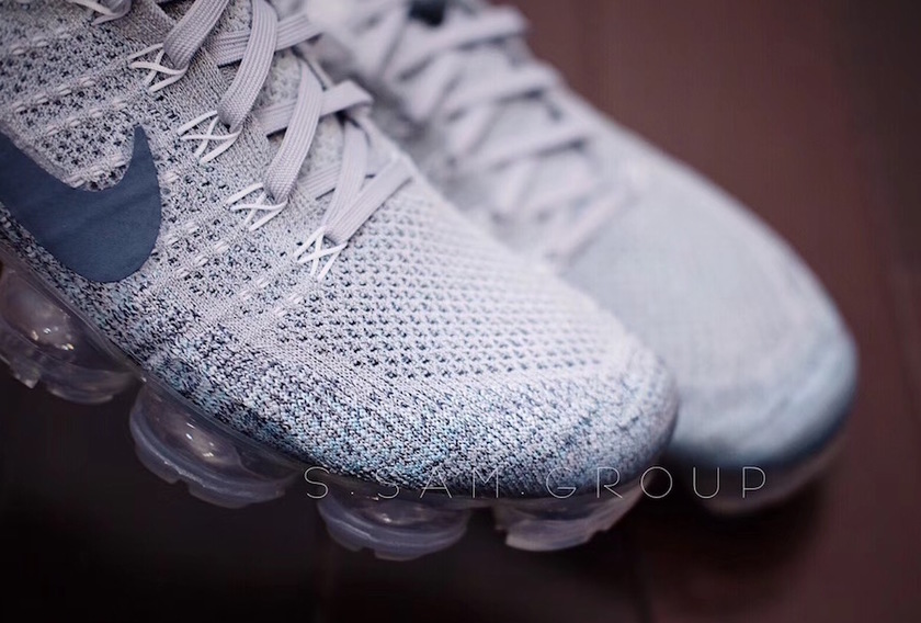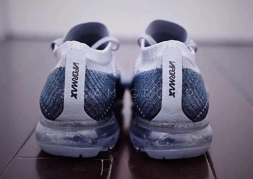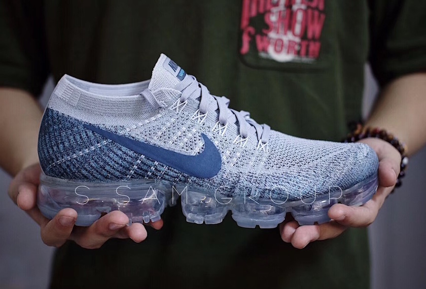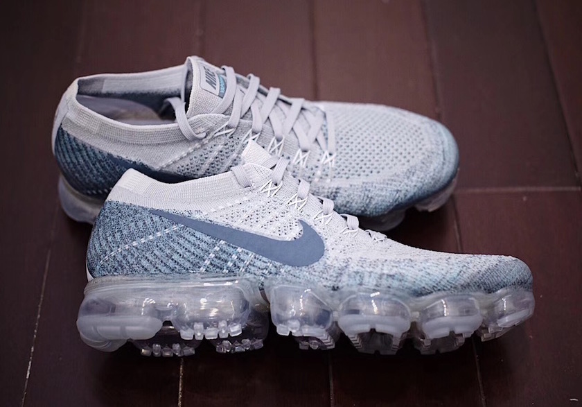 Flyknit鞋面以浅灰色作为主色调,蓝色从后跟渐变蔓延至鞋头,搭配蓝色的Swoosh LOGO及鞋舌LOGO,柔和的色调不仅百搭,也让视觉效果更加舒适。最后搭配浅灰色透明Vapormax气垫鞋底,相信会成为一款人气爆棚的优质配色。