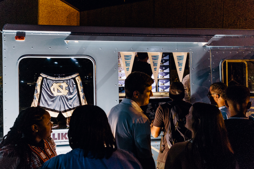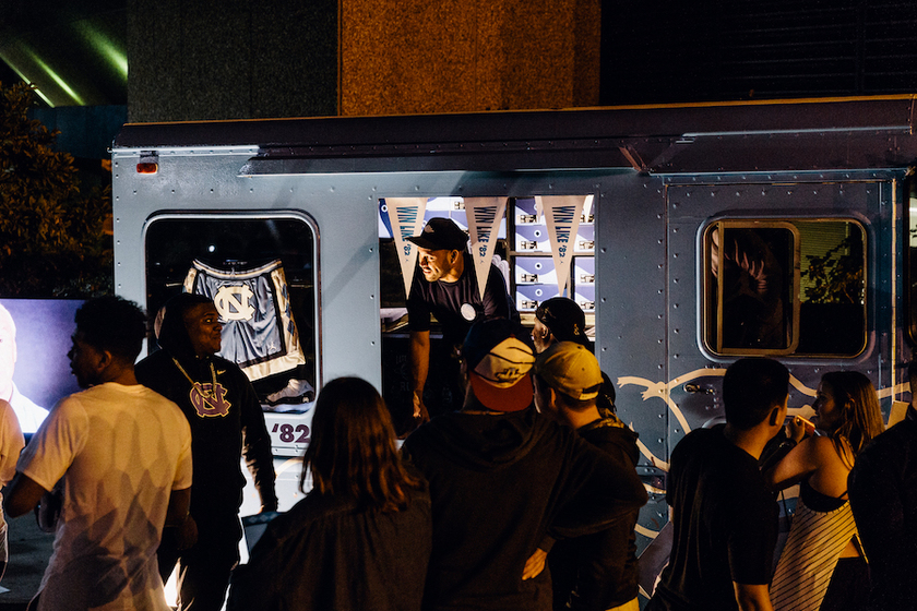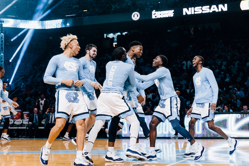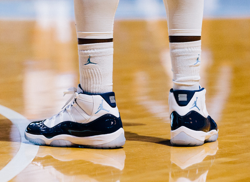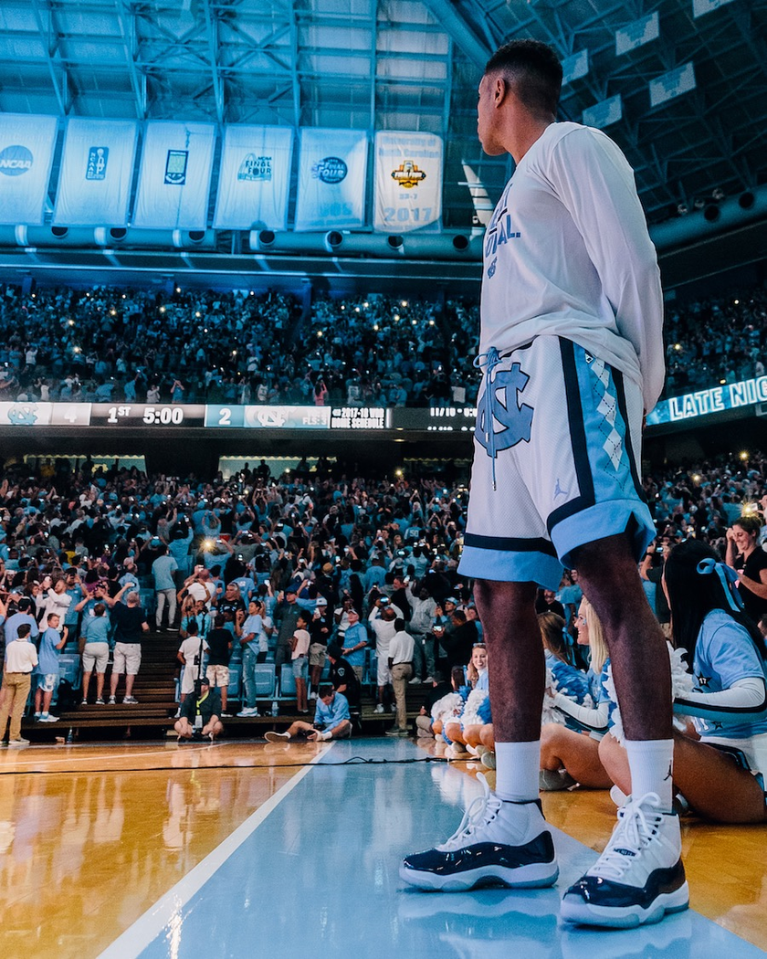 UNC球员们为庆祝全国冠军的旗帜亮相也在昨天晚上的比赛中提前上脚了该款球鞋,以及全新设计的Just Don x Air Jordan球裤也一同亮相。