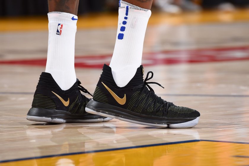 今日的揭幕战中,勇士球员Kevin Durant上脚了一款黑/金配色的Nike KD 10 PE。鞋款除了引人瞩目的金色Swoosh外,黑色的鞋面搭配白色大底透露出一种简约美感。