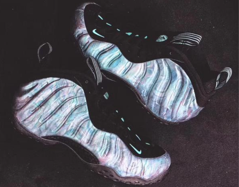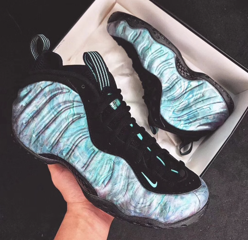 配色灵感源自鲍鱼壳内壁花纹,这款Nike Foamposite One PRM “Abalone”在近日又流出了实物图片。与此前的实物谍照相比,这回的实物鞋面花纹看起来更接近水蓝色,与Swoosh和鞋舌图案颜色相当一致。同样的黑色大底和内衬组合一起构成了鞋款的配色风格。