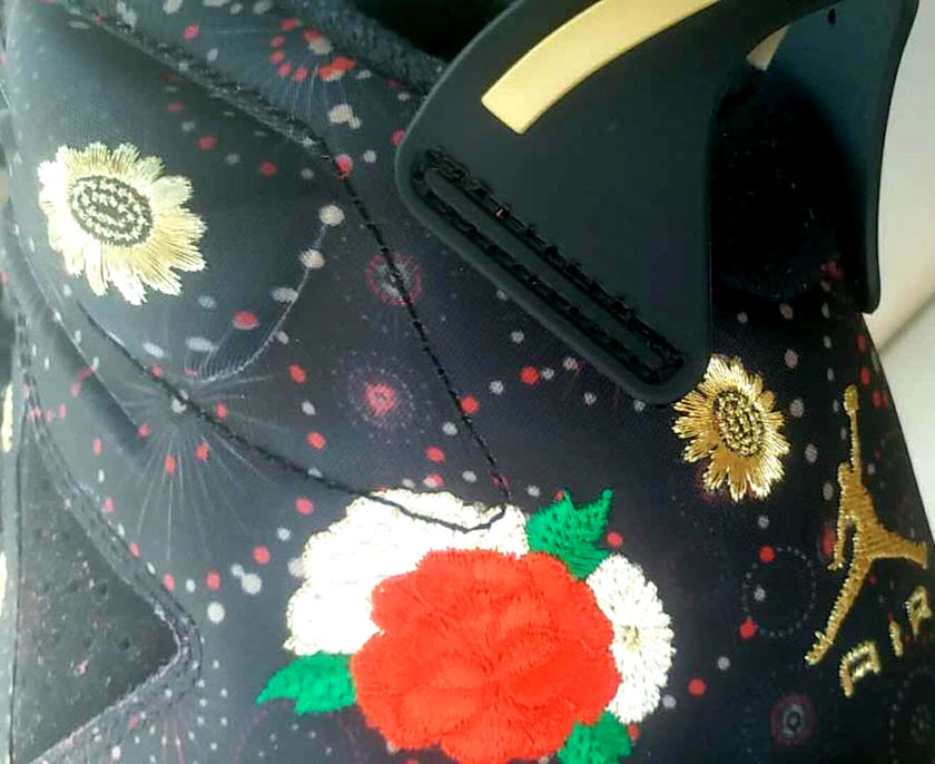 继昨日流出的Air Jordan 6 “CNY”谍照后,今日又有一张实物谍照流出。可以看到除了后跟的金色刺绣外,鞋款还将拥有中国风十足的牡丹刺绣加持,烟火图案的点缀也让这款鞋更具“年味”。