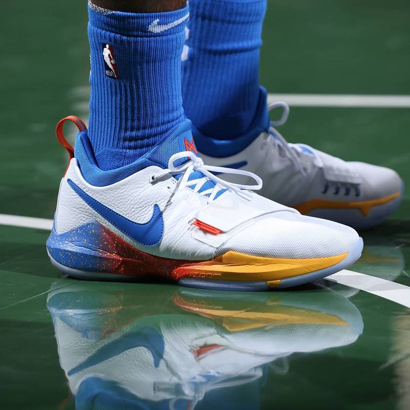 在今日雷霆对阵雄鹿的比赛中,Paul George上脚了一款全新配色的Nike PG 1 PE。鞋款以质感十足的白色荔枝皮和网面拼接打造鞋面。鞋舌内衬、Swoosh、中底以及细节处分别点缀了蓝色、红色和黄色。