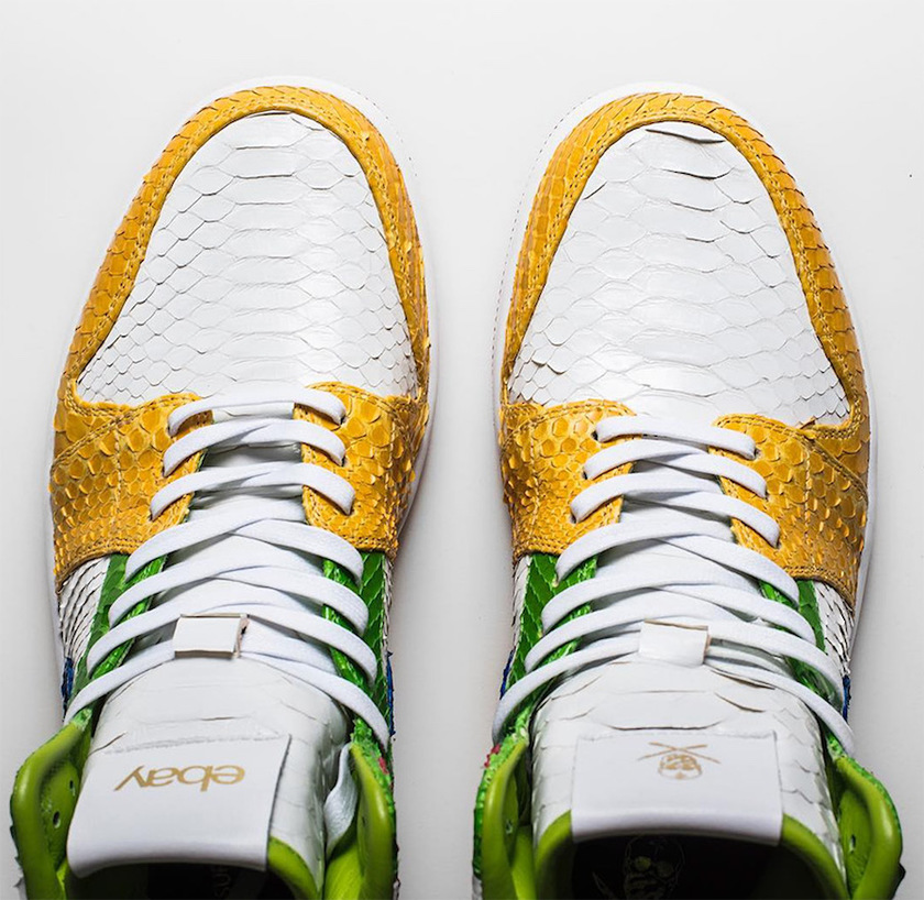 鞋款以 eBay 标志性的缤纷色彩打造,蟒蛇皮纹理的皮质鞋面也是带来奢华质感。同时 eBay 和 The Shoe Surgeon 的 Logo 分别出现在了左右鞋舌上。