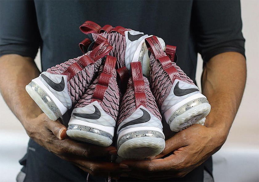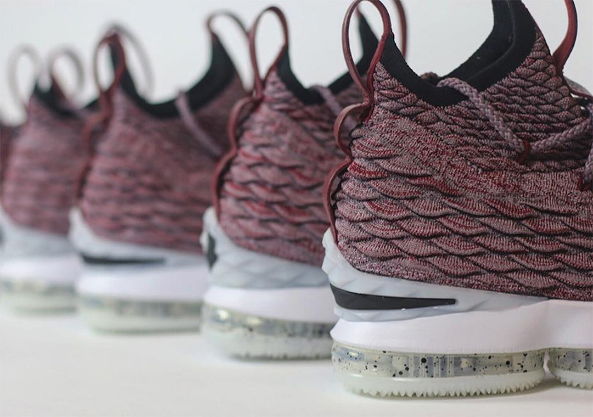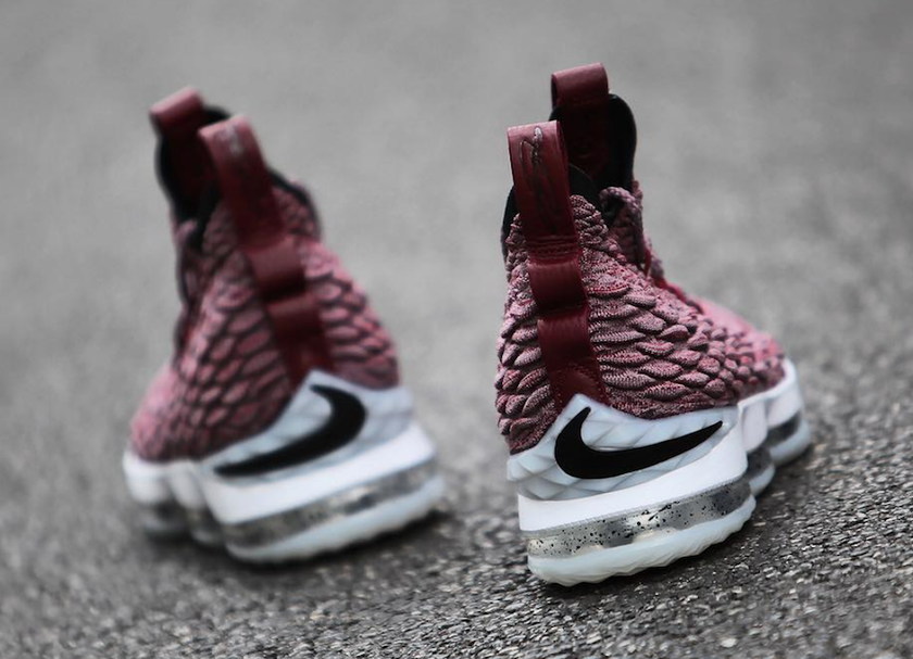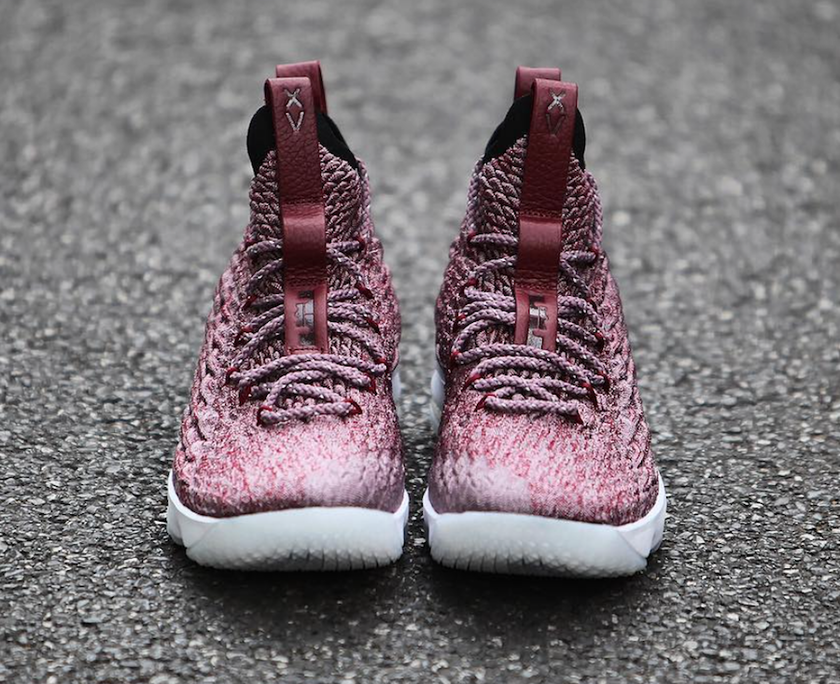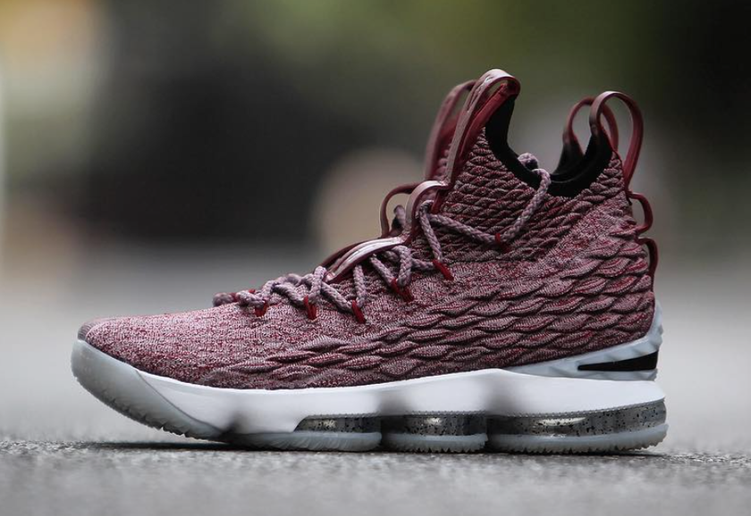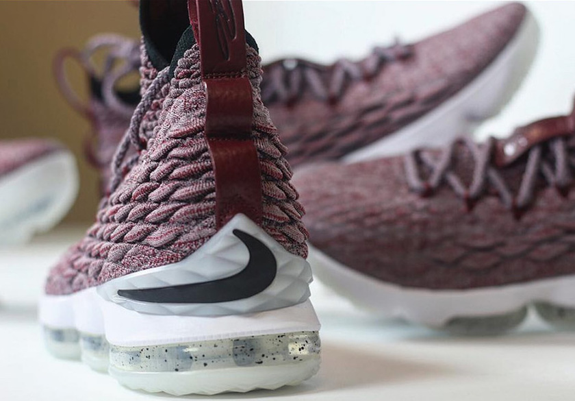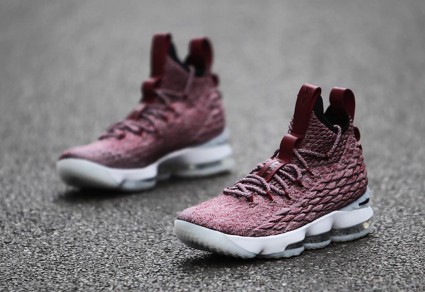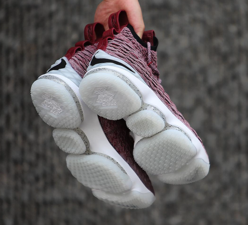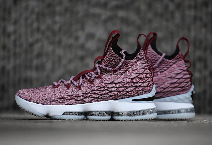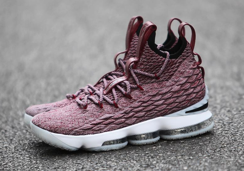这款Nike LeBron 15以克里夫兰骑士队球衣上的酒红色为灵感,又或是彰显LeBron对红酒的喜爱,鞋款将优雅的酒红色渲染了整个Battleknit鞋面,搭配突显质感的皮革鞋提,最后搭配白色中底和透明水晶大底收尾。
