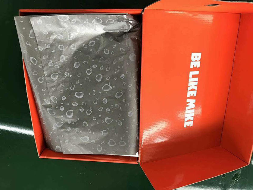 从此次释出的图片中可以看到,“Like Mike”的特致鞋盒为橙色,鞋盒上印有“Mike”字样以及佳得乐经典闪电Logo,鞋盒内的防尘纸也相当别致。
