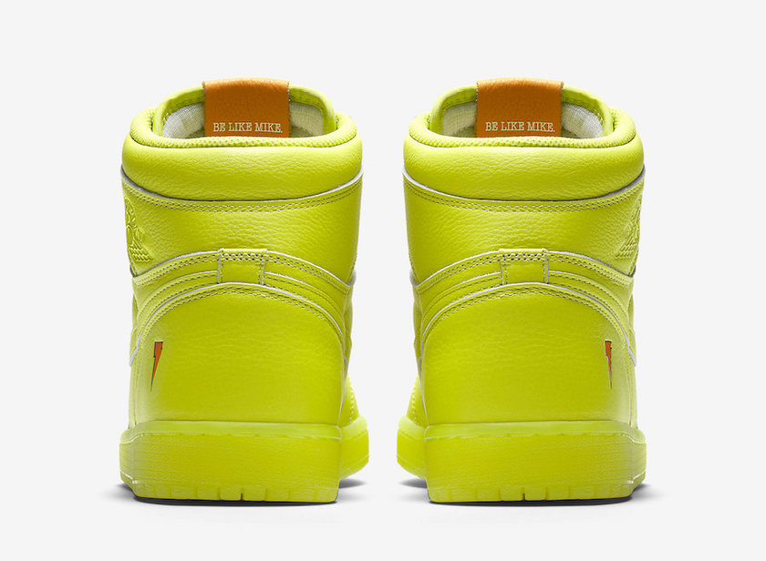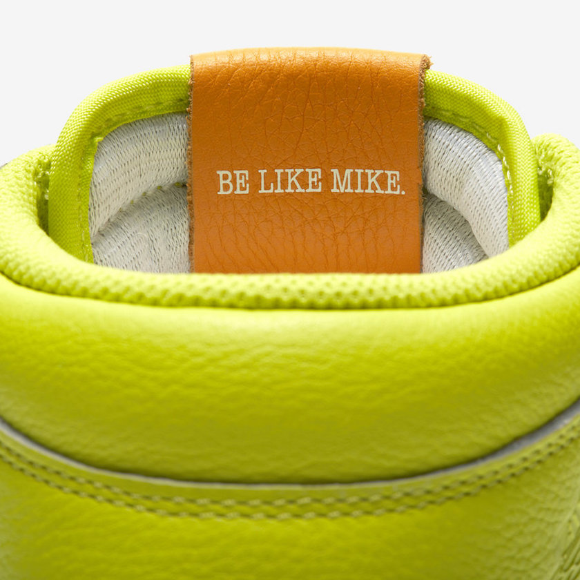 这双鞋整体以柠檬黄覆盖,鞋舌Nike Air Logo以橘色呈现,内侧印有“Be Like Mike”字样,脚踝处辅以佳得乐标志性闪电Logo点缀。最后由亮黄色半透明水晶外底收尾,鞋底浮现佳得乐Logo,整体给人一种青春活力的感觉,让人垂涎欲滴。