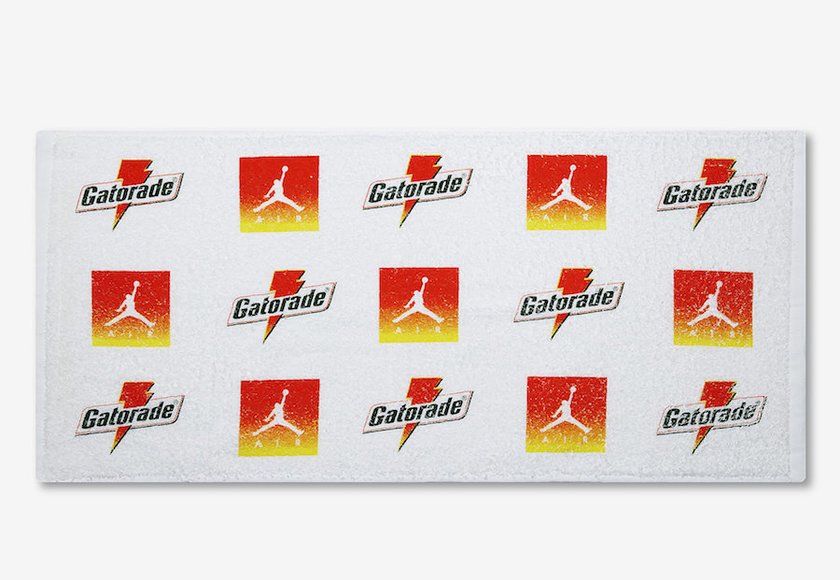 此外,随鞋还附赠橙色飞翼Logo、黄白橙三色鞋带以及印有佳得乐闪电标和Jumpman Logo的毛巾一条。