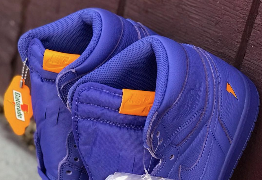 这双鞋以紫色加身,同其他四双一样,鞋舌有橙色Nike Air Logo,脚踝处辅以橙色佳得乐经典闪电Logo点缀。
