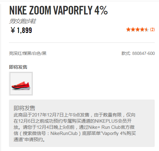 采用了 ZoomX 缓震材质的跑鞋一直都是限量发售,货量较小也使其一鞋难求!12 月 7 日将迎来全新的Nike Zoom VaporFly 4% 大红配色,发售价 ¥1899 RMB,但目前市场转卖价格均在 2000+ 。下面是 Nike 官方的发售详情,需要提前预约登记,商品详情页面已经上线,感兴趣的朋友不要错过了。