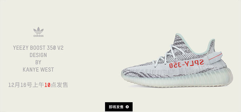 在这里送上 adidas 中国区官网 Yeezy 350 V2 “Blue Tint” 抢购直达链接(点此进入),将在明早 10 点正式发售,发售价格 ¥1899 RMB,祝大家好运啦!