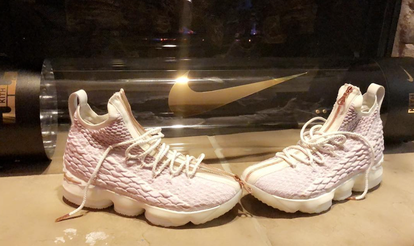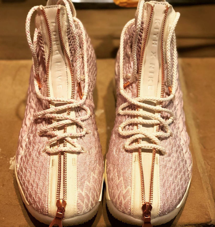 第二双则是一双骚粉配色——KITH x Nike LeBron 15 “Rose Pink”。这双“Rose Pink”以粉色和白色为主基调,同样搭配显眼的金色拉链,但相比前一双SVSM,这双更显骚气。