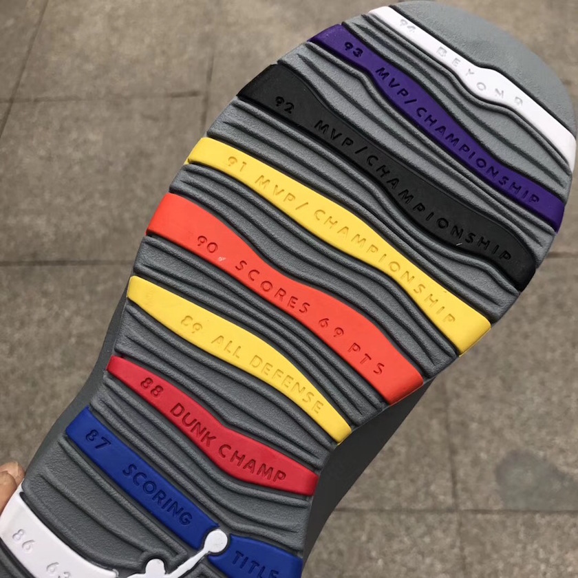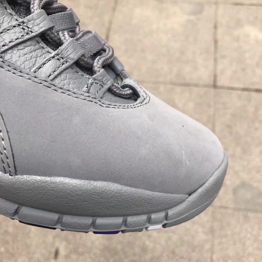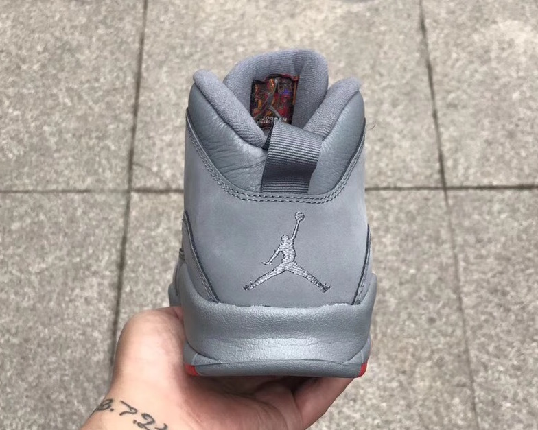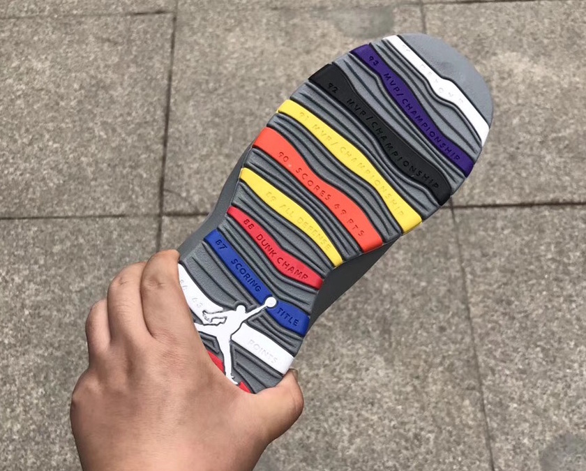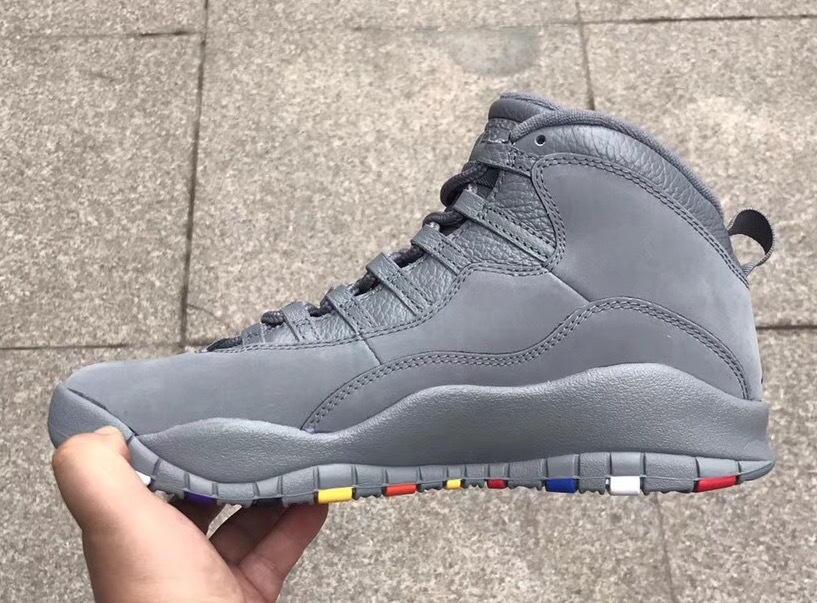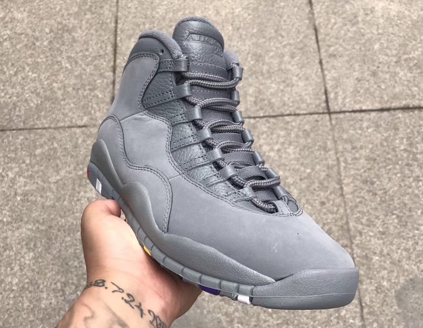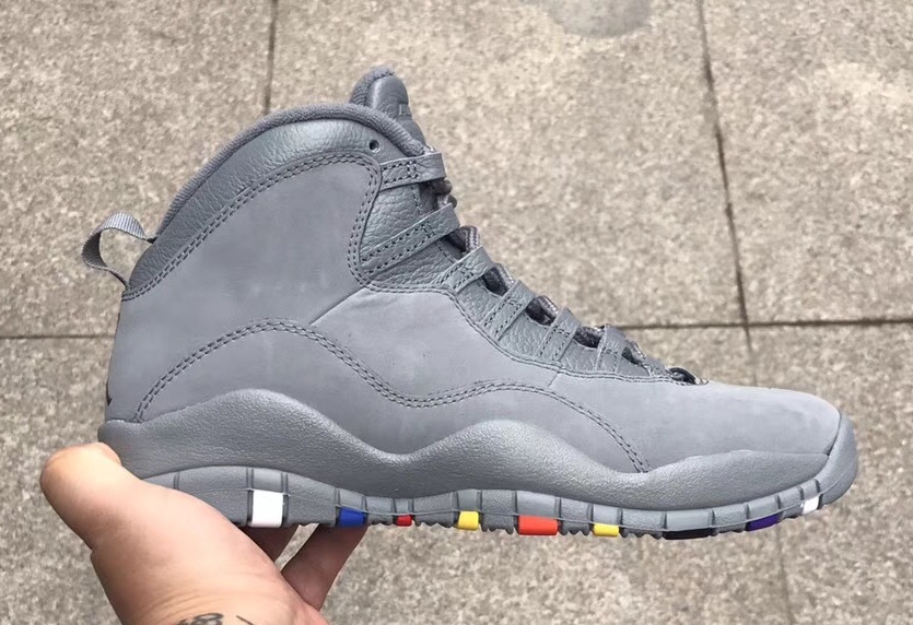 这双Air Jordan 10采用经典的“Cool Grey” 为配色方案,鞋面以及中底部分全部由灰色组成。而其大底部分,则以灰色为主,辅以彩色条纹点缀。使整双鞋款在其低调的外观下,隐藏着绚丽多彩的纹路。