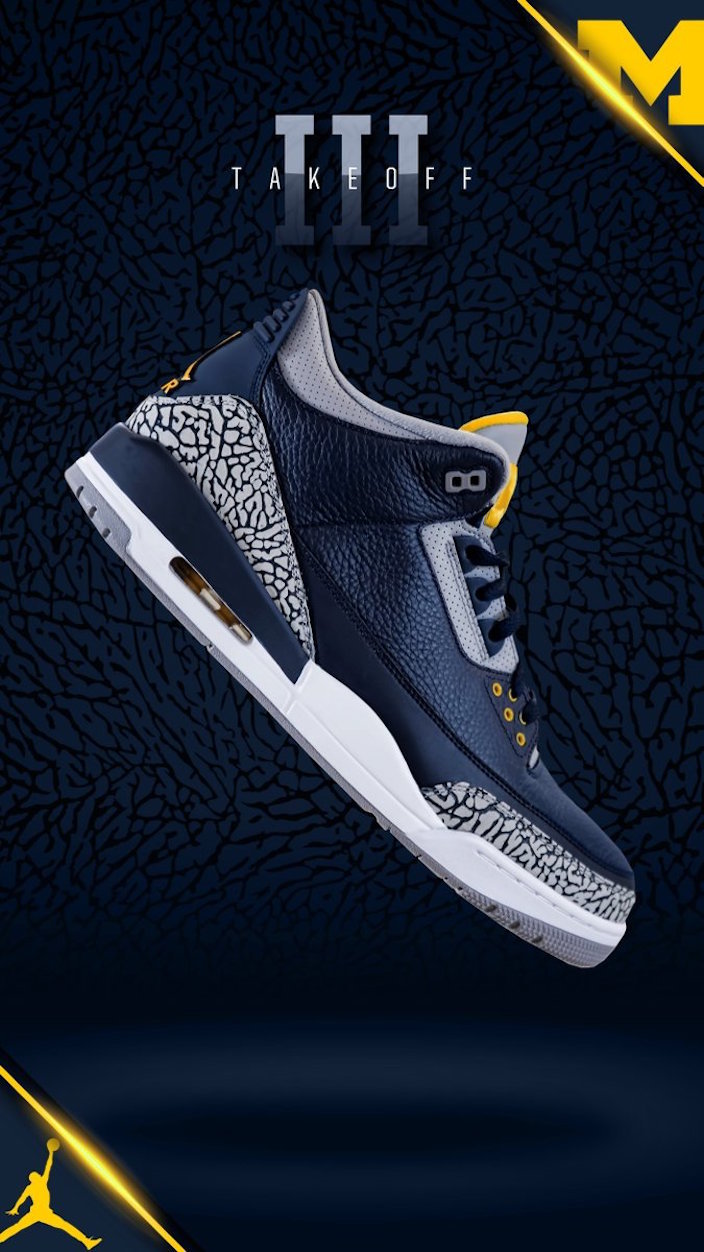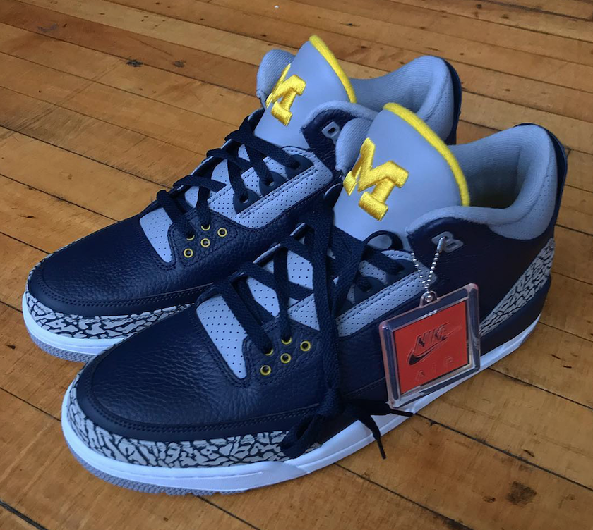 其中AJ3有点类似于明年即将发售的Air Jordan 3 “Black Cement”,不过其蓝黄的配色方案和鞋舌上大大的 “M” Logo已经证实了它的不凡。据悉,这双Air Jordan 3 Michigan PE不会市售,我们也只能眼馋的看看了。