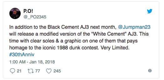 在Air Jordan 3 三十周年庆之际,Jordan Brand 不但将经典配色 “Black Cement” 黑水泥复刻回归,还将发售一款类似 “White Cement” 白水泥装扮的Air Jordan 3。
