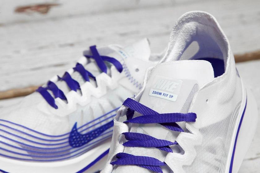 Nike 又为大热跑鞋 Zoom Fly SP 带来了全新的“Royal”配色。由半透明弹力编织材质构成鞋身选择白色作为基调,而如鞋面的条纹、鞋带及后跟的“8:88:88”数字时钟等细节则以蓝色调简约呈现,再置于高回弹的双色调 Lunarlon 泡沫中底之上。定价为 £150 英镑,目前该鞋款已可经由 Footpatrol 等指定店铺购得。