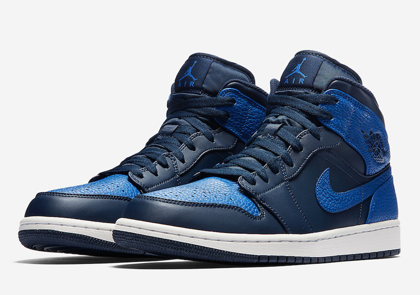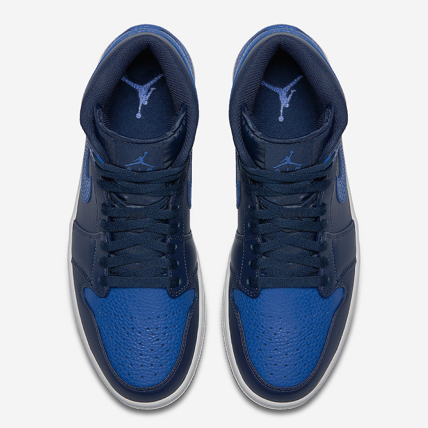 鞋款以8孔 Air Jordan 1 Mid 鞋型为蓝本,将沉稳的黑曜石色调与耀眼的皇家蓝色调相碰撞,经典光滑的牛巴革与极具质感的荔枝皮相结合,打造出了这款类似黑蓝装扮的鞋款。