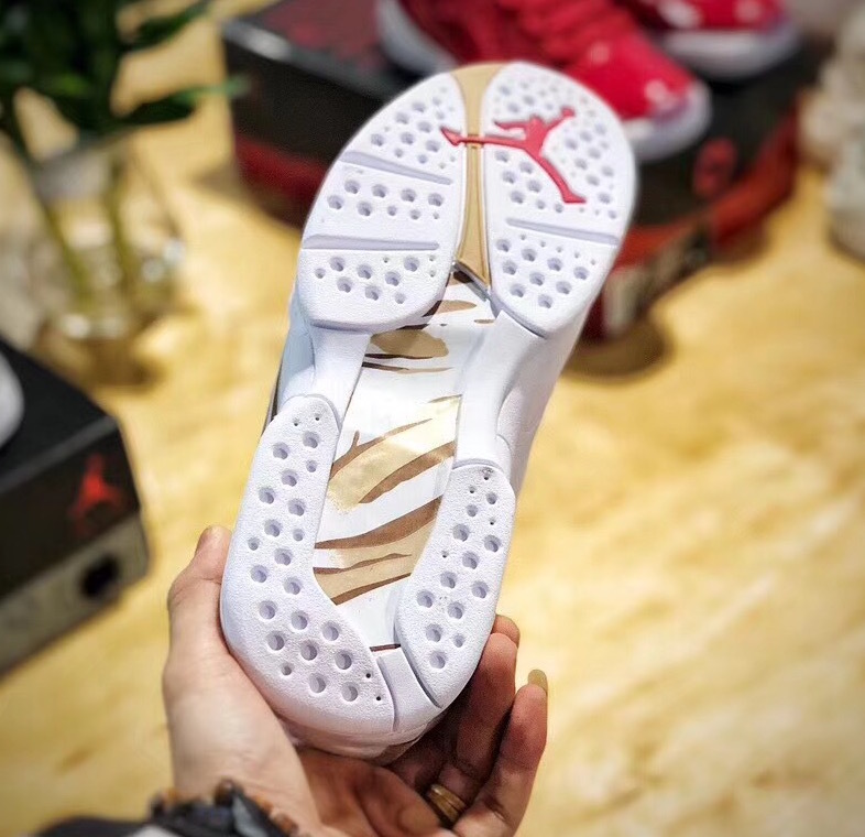 其白色的鞋面因为荔枝皮的注入,显得质感非凡。鞋舌上的红色飞人Logo和中底、大底处的金色细节,将原本色调单调的鞋面点缀,整体看起来简约而又大气。后跟的金色鞋提印有标志性的猫头鹰图案,彰显OVO尊贵身份。