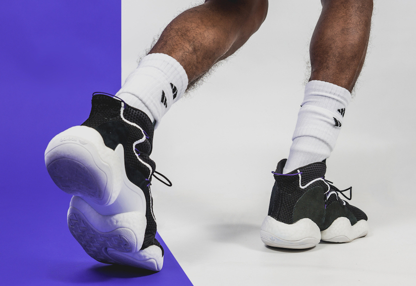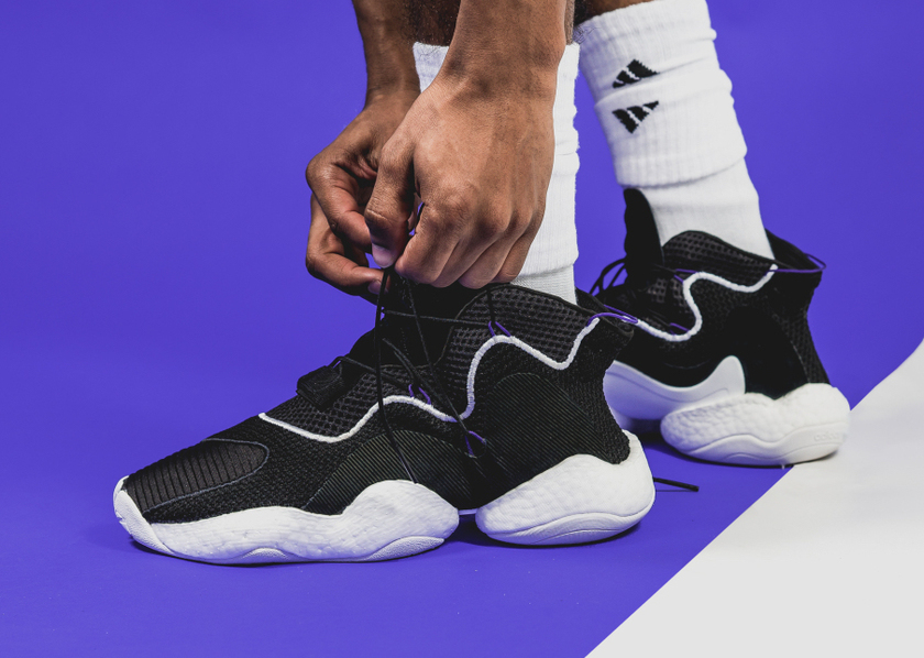 这双 adidas Originals Crazy BYW LVL 1 采用经典的黑白撞色设计,鞋面由编织材料搭配透气网布的方式呈现,搭配“天足”造型的白色Boost中底,熟悉而又陌生。黑色的鞋面中注入少许紫色细节,营造出一种高级感,搭配套袜式的设计,整体个性时尚,高街风十足!