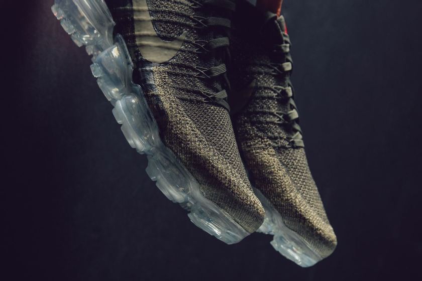 自然百搭的橄榄绿鞋身搭配部位数位迷彩效果,而当中设计最为吸睛细节为 VaporMax 气垫大底后跟部分,意外采用小面积的粉色点缀,与鞋舌的 Nike 标志呈现同样配色。