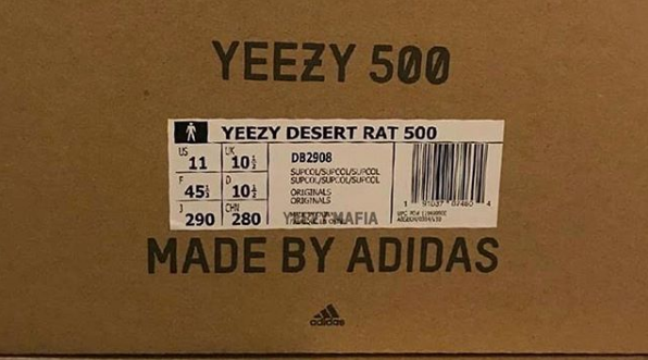 可以看出YEEZY Desert Rat 500的鞋盒的样式同Yeezy 350一致,除了将350改为500外,似乎并没有什么不同。还以为老爹鞋的鞋盒也会设计的非常复古呢!